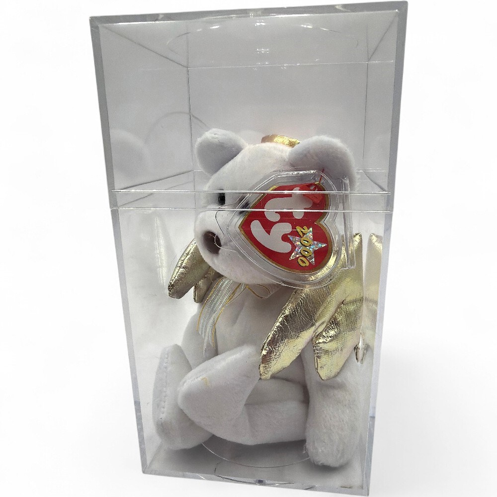 A Halo II the Bear, a collectible plush toy produced by Ty in 2000. This bear is known for its white, iridescent fabric body, a brown nose, and gold-colored wings and a halo. It has a birthday of January 14, 2000 and was retired on April 6, 2001. 7" H New in original packaging.
