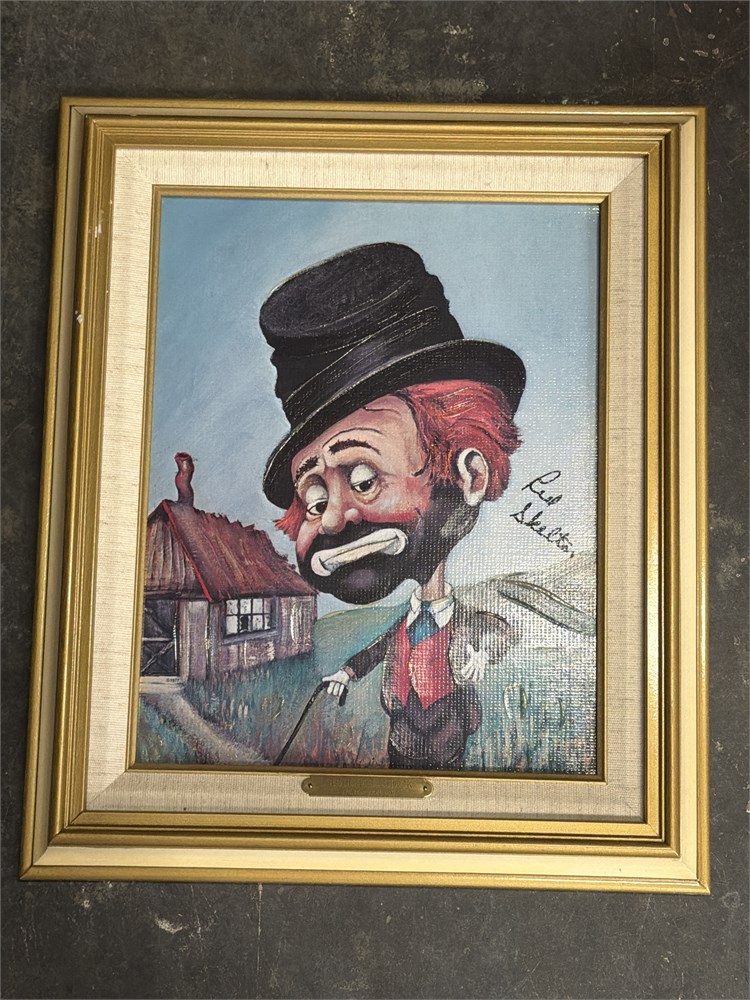 A limited edition reproduction of the famous artwork titled "Freddie's Shack" by the American entertainer and artist Red Skelton. Skelton was well-known for his clown paintings, a hobby he pursued throughout his life and which eventually became a very successful second career. Richard Bernard "Red" Skelton (1913–1997), a celebrated American comedian, radio, and TV star who also became a prolific painter of clowns. This work is titled. "Freddie's Shack", and is one of Skelton's iconic clown portraits. The original work was an oil painting, but this reproduction is a signed, limited-edition lithograph on canvas, no. 4353/5000. The artwork features Skelton's famous character, Freddie the Freeloader, standing outside a small shack. Comes with C.O.A. 23" W x 19" Good condition.