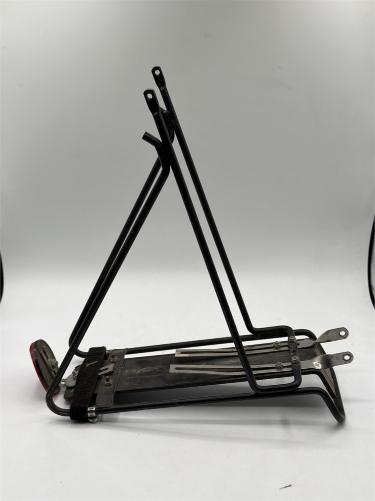 A Blackburn TR-1 Trail Road bicycle rack. It is a durable and versatile rear rack designed for use on both road and mountain bikes. The rack is constructed from lightweight and strong aircraft-grade aluminum. It features a universal fit system designed to accommodate most adult bicycle wheel sizes, including 26", 700c, 27.5", and 29". It is also compatible with disc brakes. The rack can securely hold up to 45 pounds (20.5 kg) of weight, and has a top plate that can serve as a rear fender and splashguard and includes a mount for a safety light. 15" H x 13" W Good condition.