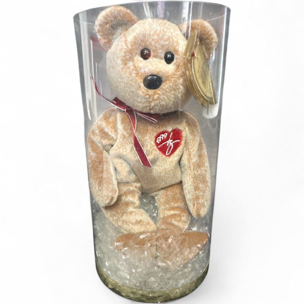 A 1999 Signature Bear Beanie Baby by Ty. This bear was a special edition collectible released in 1999, featuring a red ribbon and a heart-shaped patch on its chest embroidered with the "Ty" signature. The bears were made with P.E. (polyethylene) pellets, and comes in a clear, hard plastic collector's case or tube to protect the bear and its tags. 8 1/2" H New in original packaging.