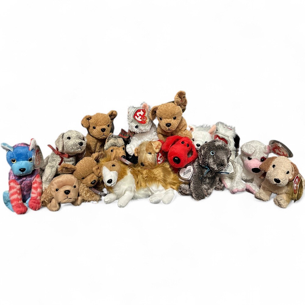 A collection of Ty Beanie Babies, which are a line of collectible stuffed toys. They are known for being stuffed with plastic pellets ("beans") rather than traditional soft stuffing. Each toy has a distinct heart-shaped "Ty" tag. They became a major fad and collectible item during the 1990s. The lot includes various breeds of dogs such as bulldogs, terriers, and dalmatians. Included are "Tuffy", "Tricks", "Hodge-Podge" and "Spunky". Tallest: 6 1/2" H Good condition.