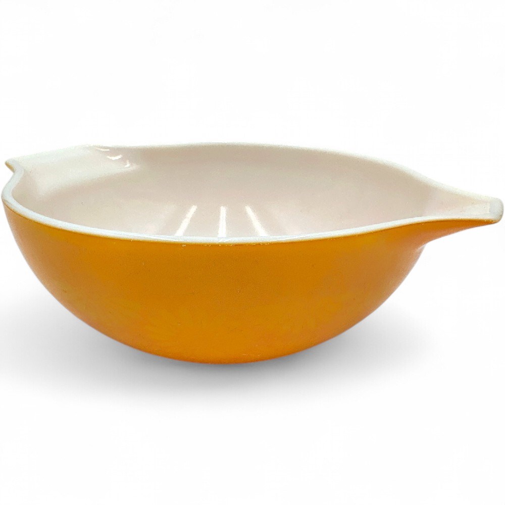 A vintage Pyrex Cinderella mixing bowl in the "Daisy" pattern. The pattern was introduced in 1968 and produced until 1973. The large yellow daisy design appears on the orange-yellow bowls in the set. Cinderella bowls are identifiable by the handles/spouts on opposite sides. The bowl is made of durable Pyrex glass, which is heat resistant. 4.5" H x 12" W; 10.5" Dia Good condition.