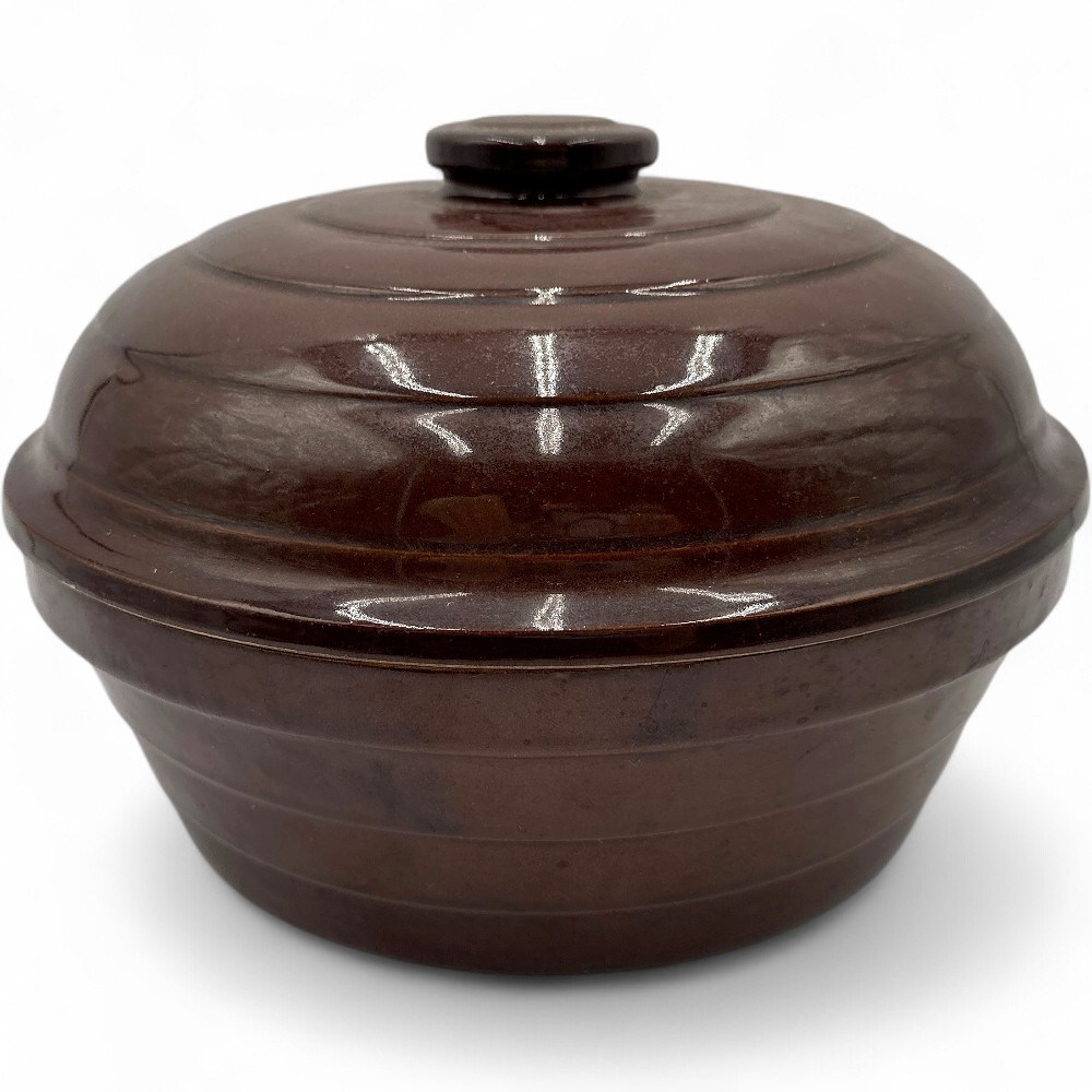 A vintage Marcrest Daisy Dot brown stoneware casserole dish with a lid. The dish features a "Warm Colorado Brown" glaze with a glossy finish. The pattern, often referred to by collectors as "Daisy and Dot," has a Pennsylvania Dutch style motif. The stoneware is ovenproof and was produced by Western Stoneware Company from the 1950s to the early 1960s. 7" H x 9" W x 9" L Good condtion.