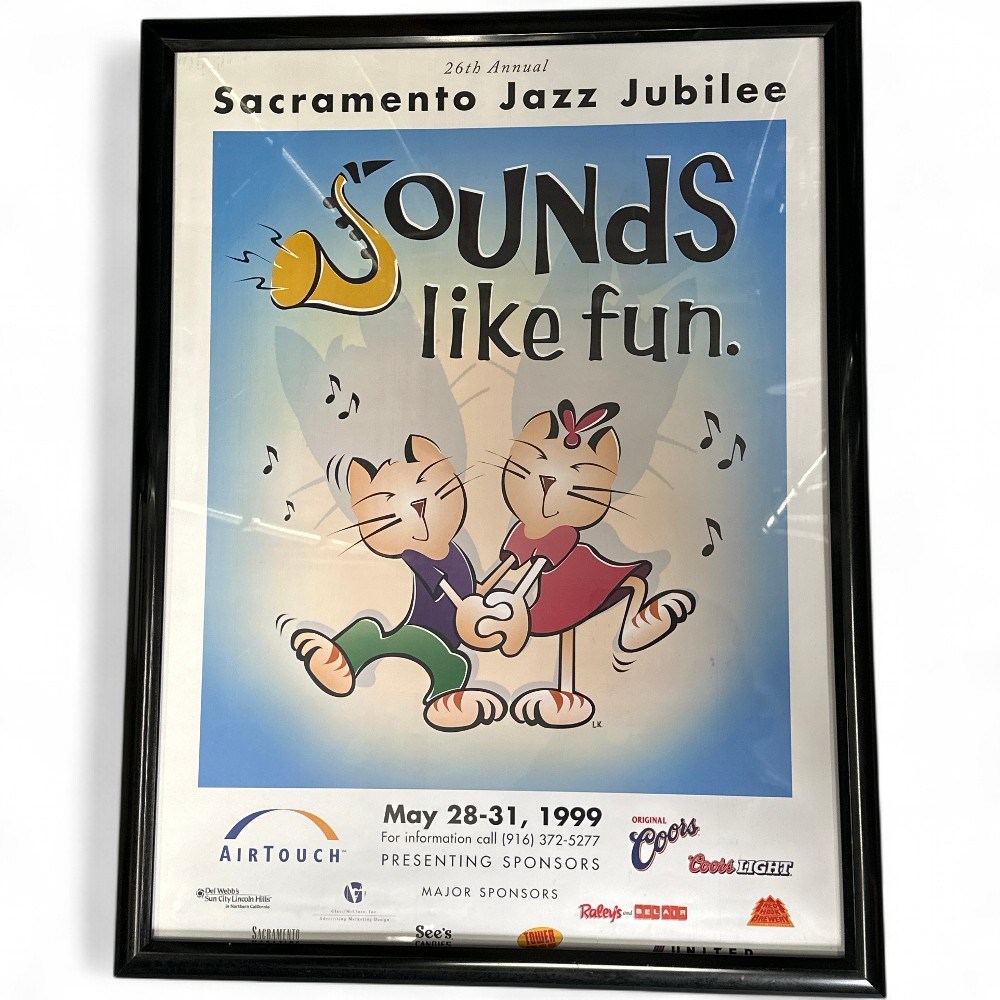 A framed poster for the 25th Annual Sacramento Jazz Jubilee, which took place from May 28-31, 1999. The poster features two dancing cat mascots and the slogan "SOUNDS like fun". The festival often used a cat as a mascot, which is a nod to the "jazz cat" slang term. The festival was organized by the Sacramento Traditional Jazz Society starting in 1974 and was once one of the most attended music festivals in the US, peaking at nearly 100,000 attendees in the 1980s. The event was held annually on Memorial Day weekend until its final show in 2017. 25" H x 19" W Good condition.