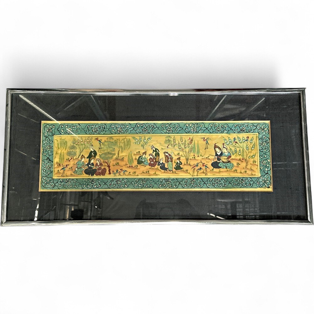 A vintage Persian miniature painting depicting a scene with multiple figures in a garden or harem setting. The artwork features a multi-figure scene with people sitting on the ground, surrounded by trees and birds. It is painted in delicate watercolors or gouache, and is set within an ornamental border and a marquetry frame, possibly made of wood, brass, and bone (khatam). It is a mid-century reproduction or decorative piece, not an authentic ancient miniature, and mimics the style of the Safavid or Qajar periods. 9" H x 20" W Good condition.