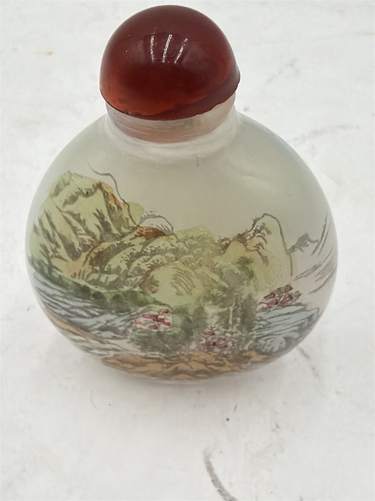 A Chinese reverse-painted glass snuff bottle with a reddish-brown stopper. The landscape scene, including mountains and water, is painted from the inside of the bottle through the small opening, a technique requiring exceptional skill. Snuff bottles were used to hold powdered tobacco and featured airtight stoppers to protect the contents from humidity. These miniature art objects were popular in imperial China and served as status symbols. 13" x 1 1/2" Good condition.