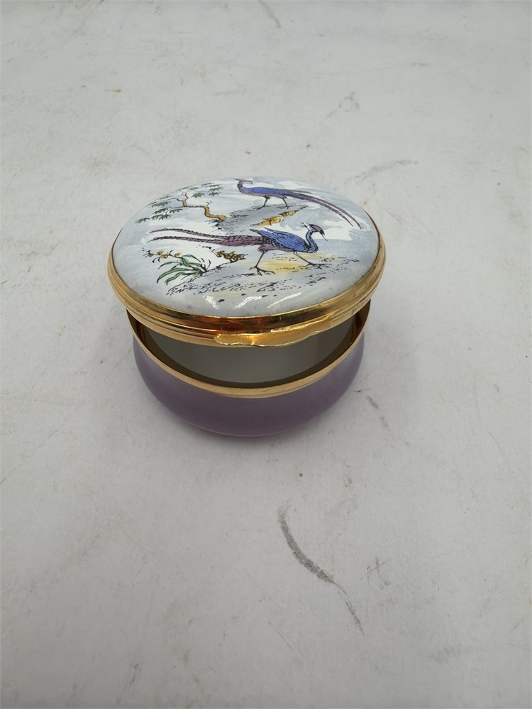 A vintage Crummles & Co. enamel trinket box. It is a collectible item, hand-painted with a bird design on the lid. Crummles boxes are known for their intricate designs and are made in England, often featuring enamel over copper. They are often used as pill boxes, ring boxes, or for storing small keepsakes. 1.5" Dia x 1" H Good condition.