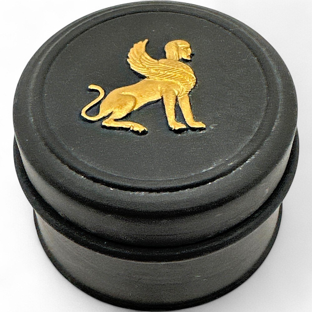 A Wedgwood black basalt Jasperware trinket or pill box featuring a gold-gilded, winged sphinx motif on the lid. It is from their Egyptian Collection of 1978. The box is made from Wedgwood's "black basalt," a fine-grained, unglazed black stoneware, with the raised relief decoration (sphinx) being hand-gilded in gold. 1 1/2" Dia x 1 1/2" H Good condition.