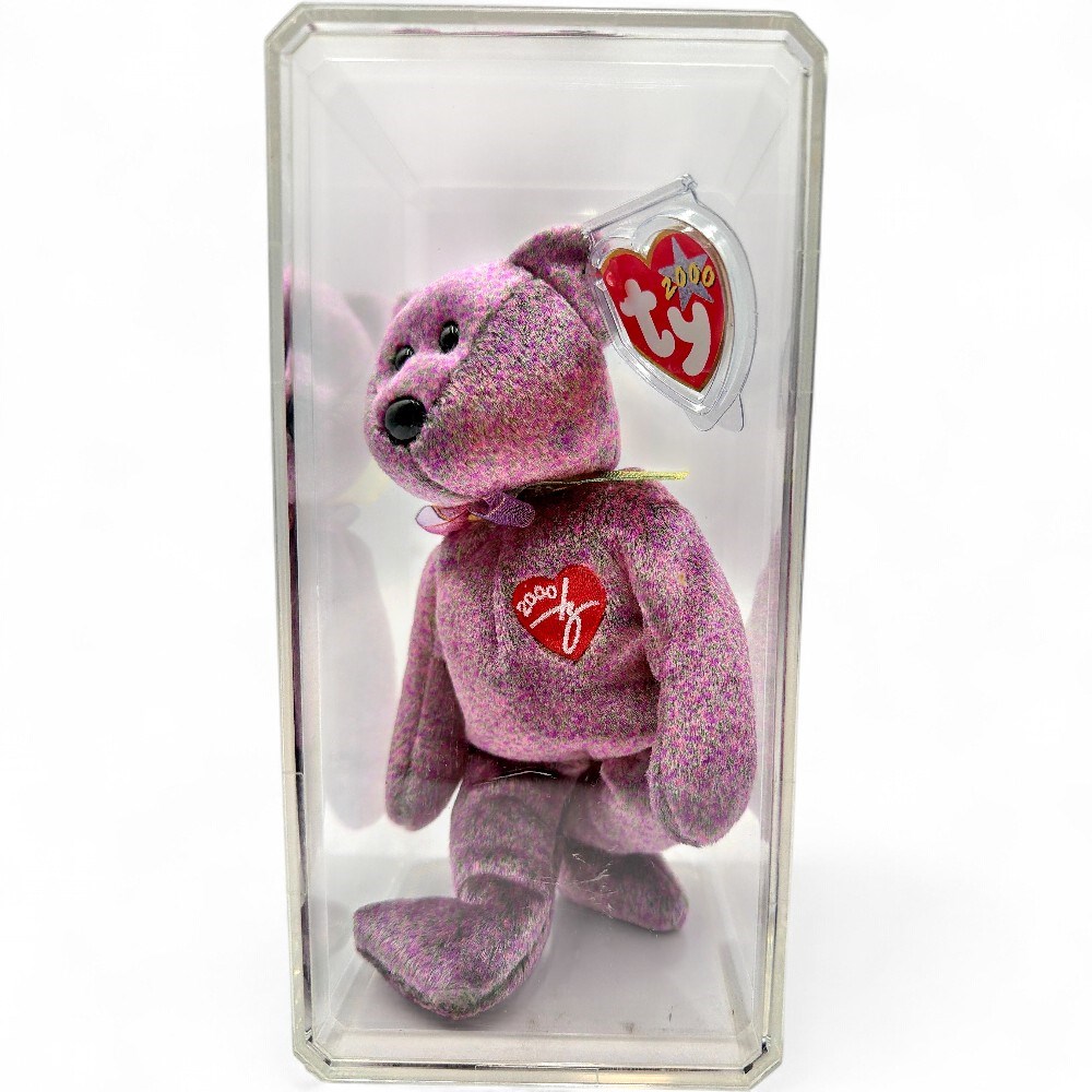 A Ty Beanie Baby 2000 Signature Bear. This collectible plush toy was produced by Ty and released on February 13, 2000. It has purple fur with multi-colored speckles. 8" H New in original packaging.