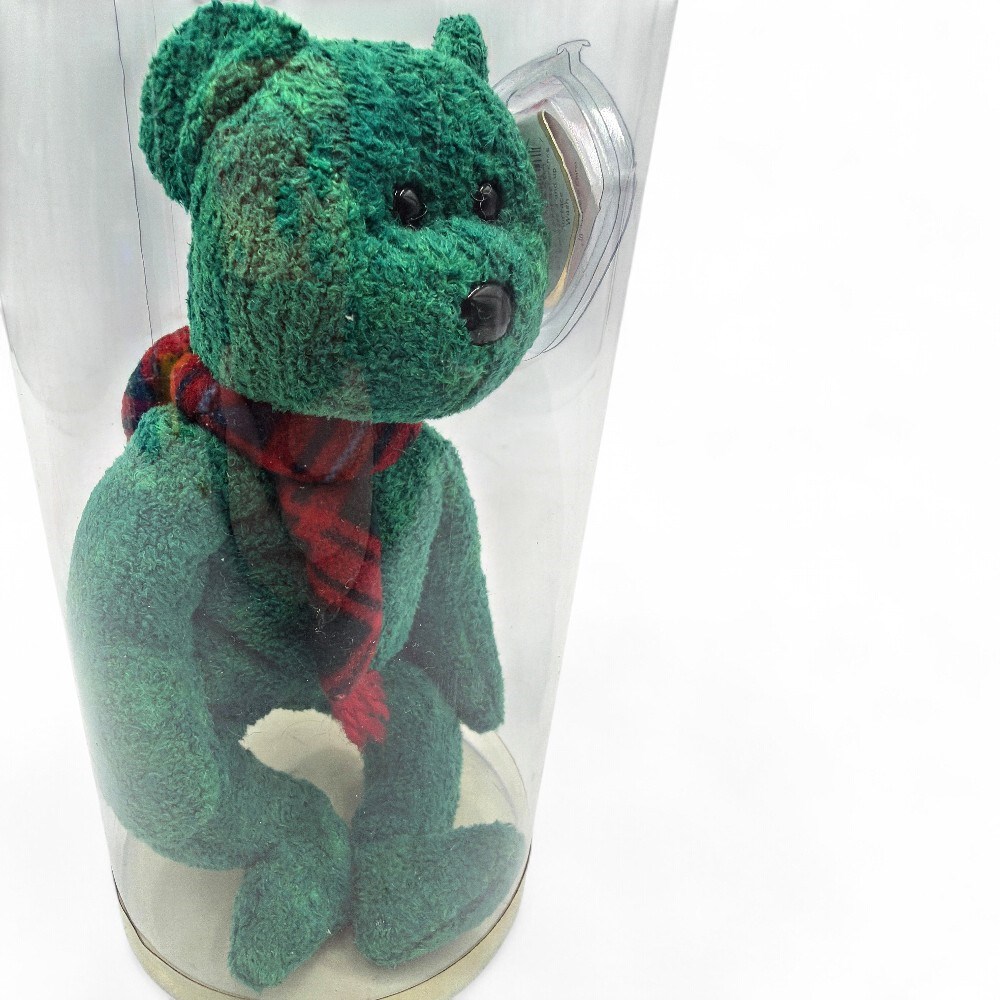 A Ty Beanie Baby "Wallace" the Bear. This collectible stuffed toy features a green fuzzy material and a red tartan scarf, and black button eyes and nose. Its birthday is January 25, 1999. 8" H New in original packaging.