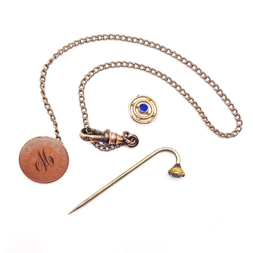 A collection of antique gold-filled jewelry items, likely from the Victorian or Edwardian eras, which are components often found in a gentleman's accessories set. The set includes a pocket watch chain/Albert chain, which is a long, curb-link chain with a swivel hook clasp at one end and a jump ring at the other is characteristic of a watch chain, also known as an Albert chain. These were used to secure a pocket watch to a waistcoat or lapel. A fob/locket which is the round, engraved disk with the initial "M" attached to the smaller chain. Fobs were decorative ornaments suspended from the watch chain and often contained a locket, seal, or monogram. The long, straight pin with a decorative head is a stick pin (or tie pin/lapel pin). The head of this pin features a small, gold-tone circle with a blue stone in the center. These were commonly worn in a tie or lapel as a decorative element. These pieces were popular accessories for both men and women during their respective time periods and are valued today for their historical significance and intricate details. The items are housed in a small pouch printed with " The Wm. Hengerer Co" which was a large department store chain based out of Buffalo, New York and started in 1836. Good condition.