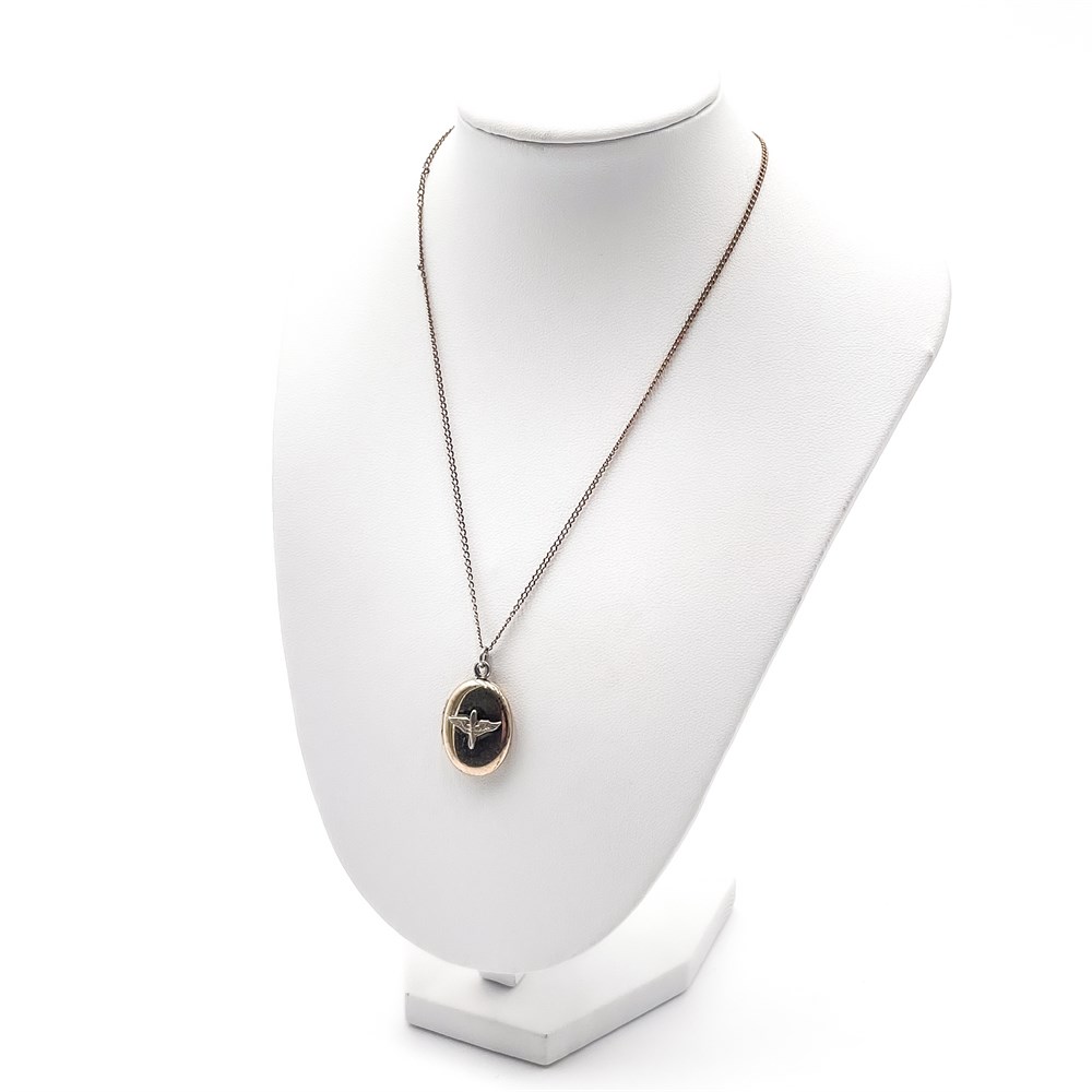 A vintage military "sweetheart" locket, specifically featuring the insignia of the U.S. Army Air Corps or Army Air Forces. The oval-shaped locket has a propeller and wings insignia, a classic symbol that has been used by U.S. military aviation branches since the 1920s. This design is often associated with the era of World War II, when "sweetheart" jewelry was popular for loved ones to wear while military personnel were serving overseas. Lockets are traditionally worn to hold small mementos or photographs of loved ones, serving as a sentimental symbol of connection and memory. H: 12" Good condition.