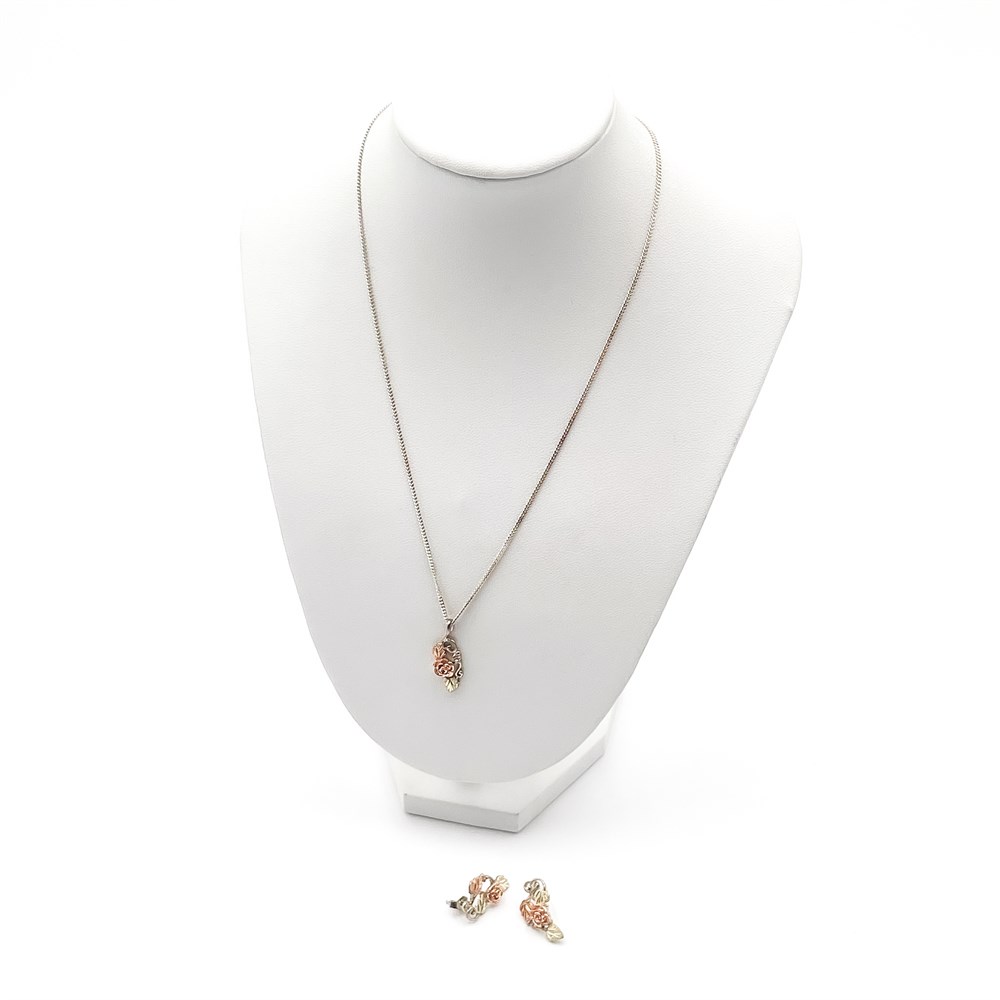 A 10K two-tone gold floral necklace and stud earrings set, in a Black Hills Gold style, featuring rose gold roses and yellow gold leaves. Both the necklace pendant and the earrings feature a coordinated, intricate floral design. They have small, sculpted roses in a pinkish rose gold hue, complemented by detailed leaves that are a standard yellow gold color. The set includes a pendant necklace on a delicate chain and a pair of matching stud earrings. H: 10" Good condition.