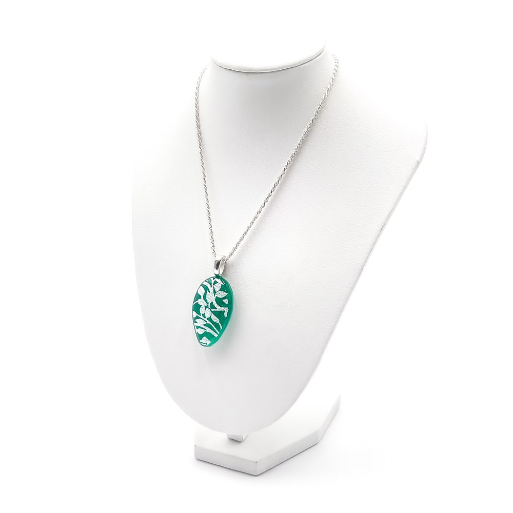 A handmade oval pendant necklace featuring a green glass base with a delicate leafy, vine-like pattern in silver. The design isartisan-crafted and set in sterling silver. H: 11.5" Good condition.