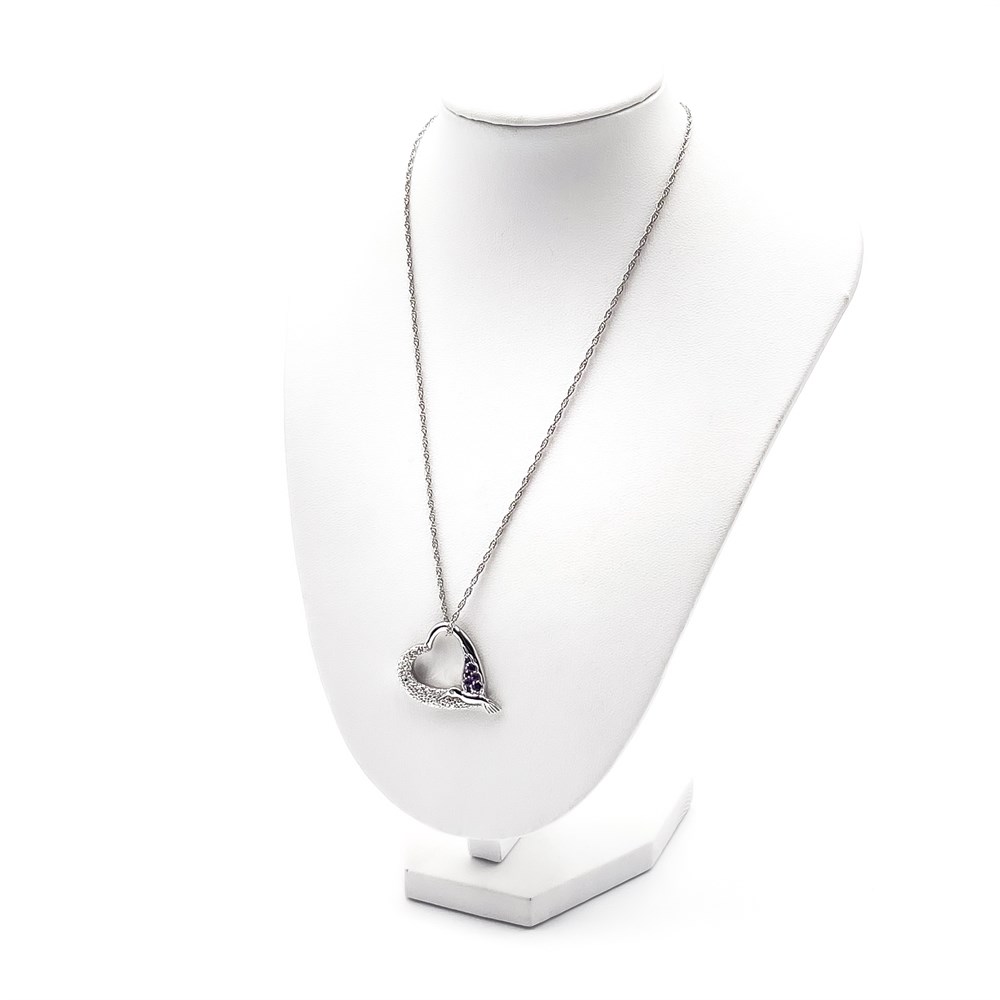 A sterling silver hummingbird heart necklace featuring purple amethysts. The pendant is designed as a heart shape, with one side having a textured, paved surface and the other side featuring the hummingbird motif with purple stones. Hummingbirds are widely considered symbols of love and devotion. H: 11.5" Good condition.