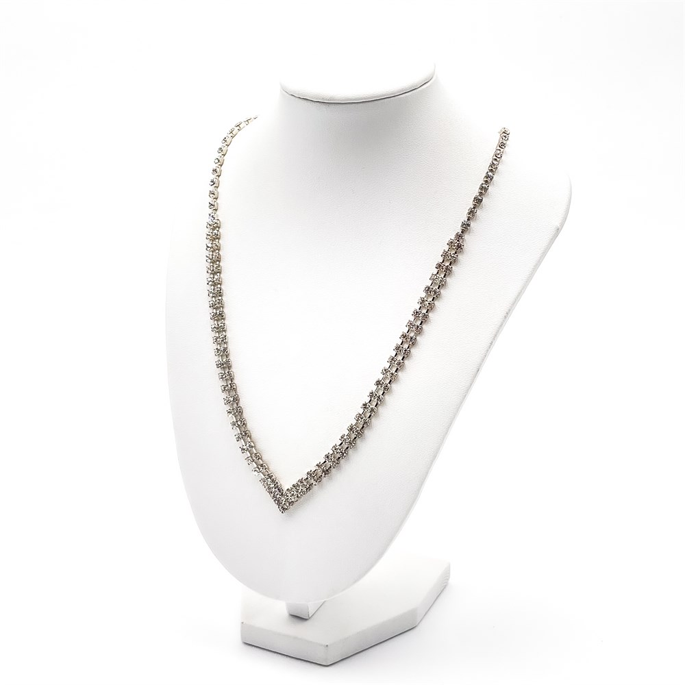 A crystal rhinestone necklace with a V-shaped design encrusted with clear, sparkling rhinestones along a silver-tone plate. It includes an adjustable chain and a lobster clasp closure. H: 11" Good condition.