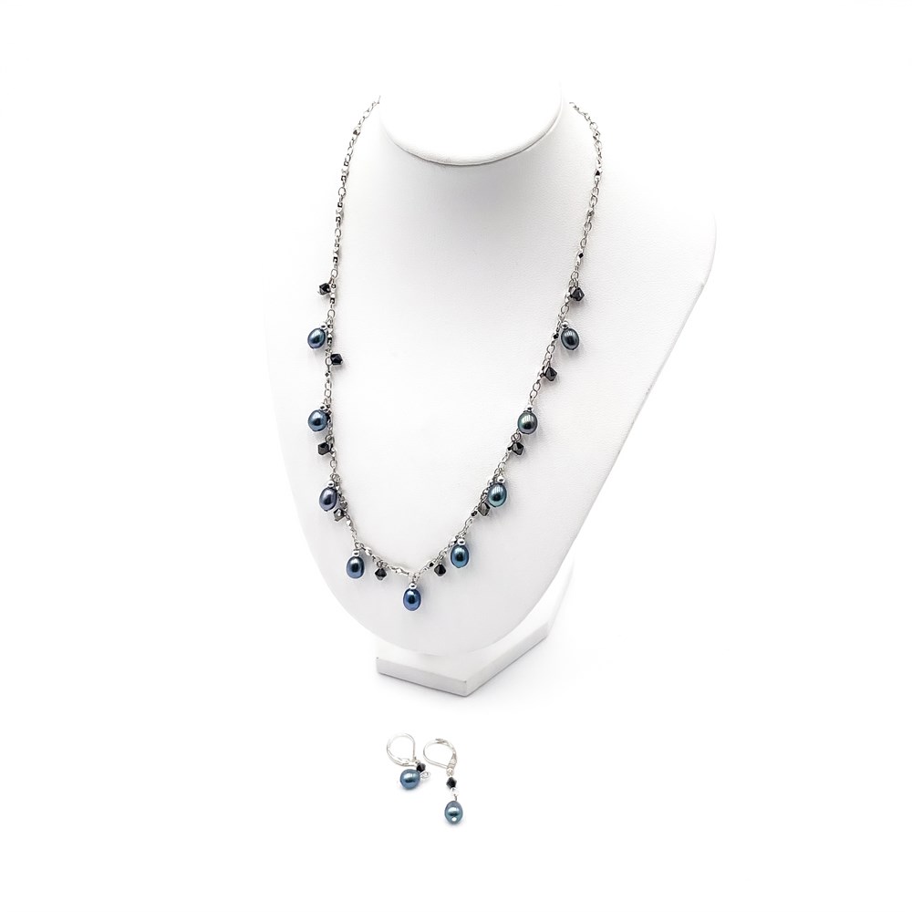 A sterling silver chain necklace and matching earrings featuring black cultured freshwater pearls and small dark crystal beads. The necklace is a station or drop style, where beads and pearls are spaced along the chain. The earrings are matching drop dangles. H: 10" Good condition.