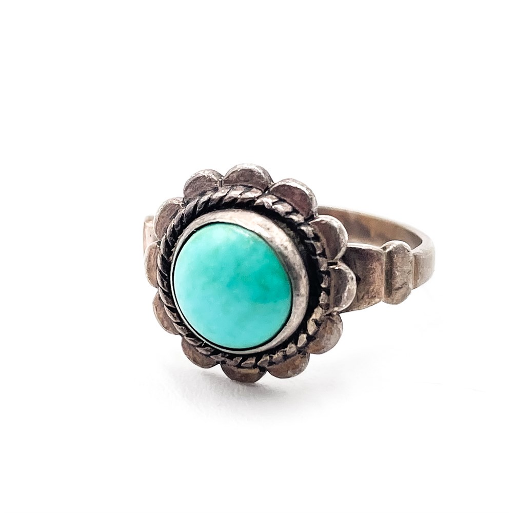 A vintage sterling silver turquoise flower or cluster-style ring, created in the Native American Southwestern tradition. The prominent feature is the round turquoise stone set in a smooth or sawtooth-style bezel. Surrounding the central stone is a scalloped edge with grooved tips, which resembles flower petals or sunbursts. A twisted silver rope border accents the base of the bezel. The band of the ring has decorative, hand-stamped or cast details on its shoulders. Size: 6 good condition.