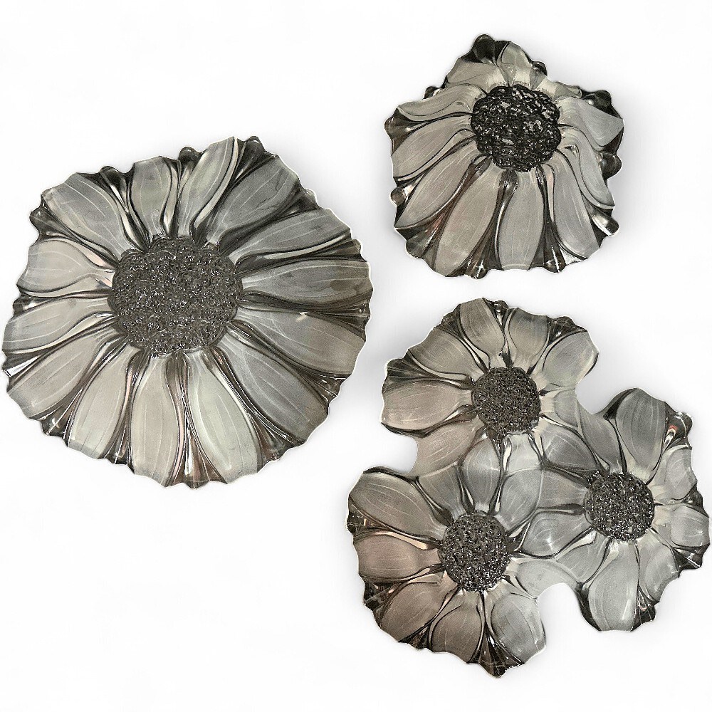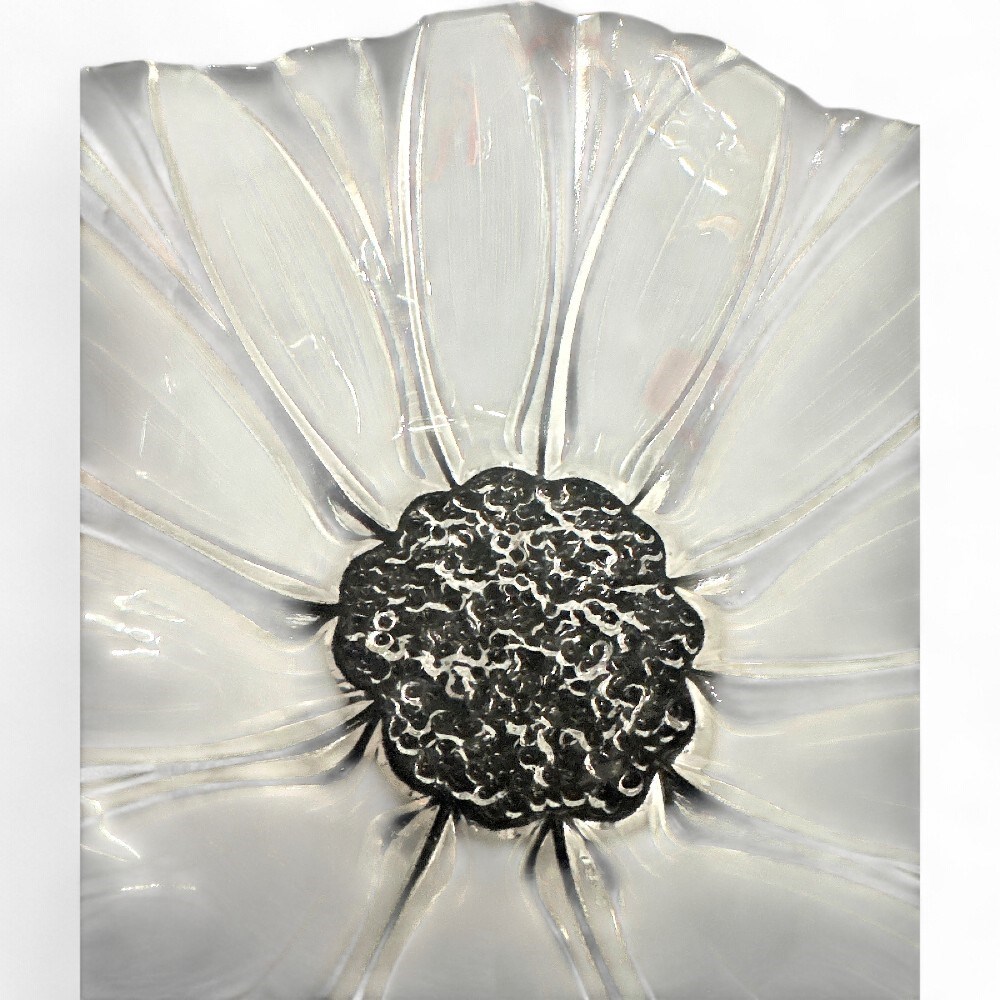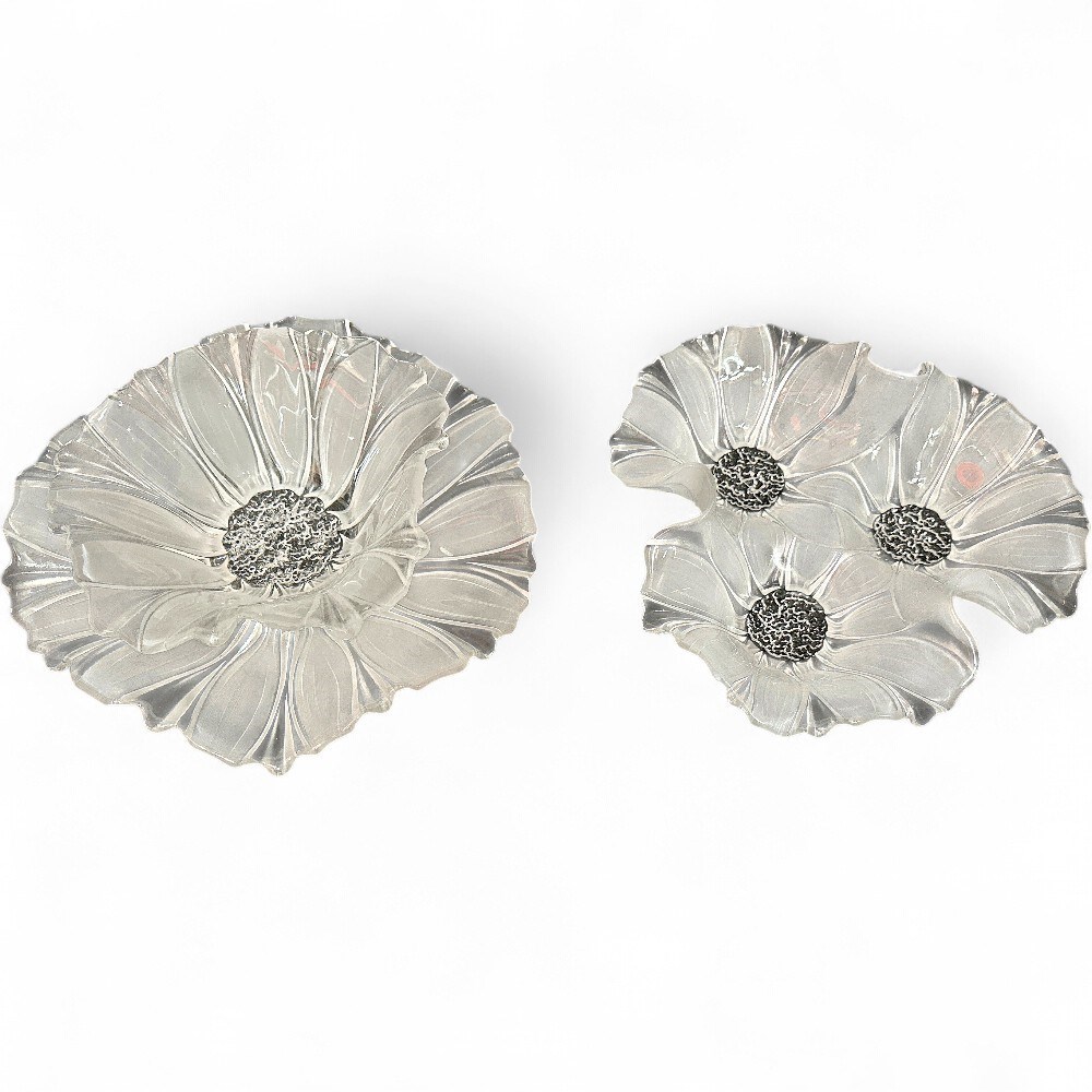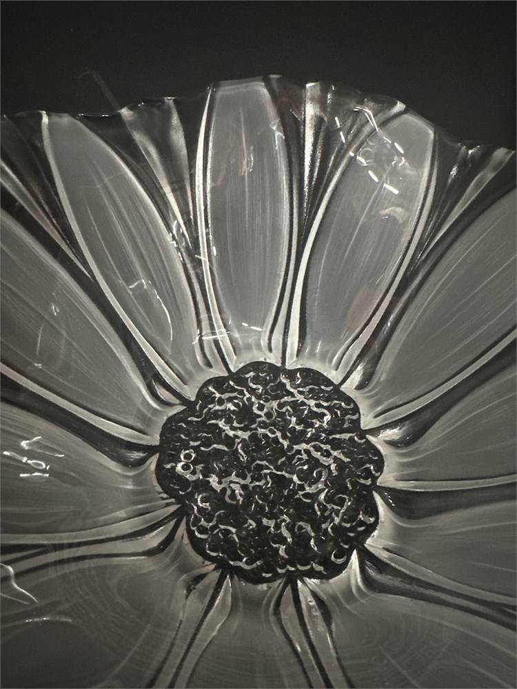 A set of three vintage Mikasa Sunflower Frosted crystal glass dishes. The collection includes various sizes of bowls and platters, which can be used as serving dishes or decorative centerpieces. They feature a distinctive Art Deco or contemporary style with a clear, glossy finish and a sunflower pattern fused into the glass. The dishes were crafted by Mikasa in the 1980s or 1990s and are considered collectible items. Largest plate: 11" Dia; Smallest bowl: 8" Dia Good condition.