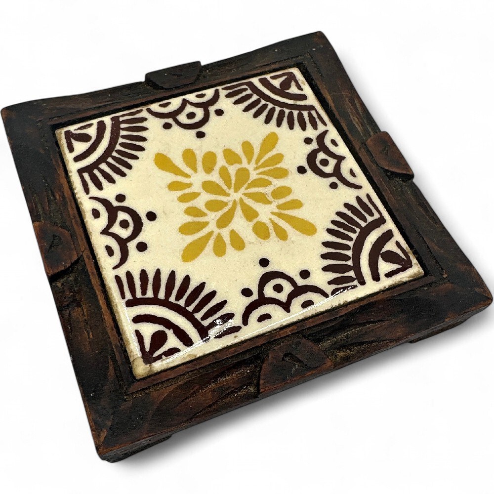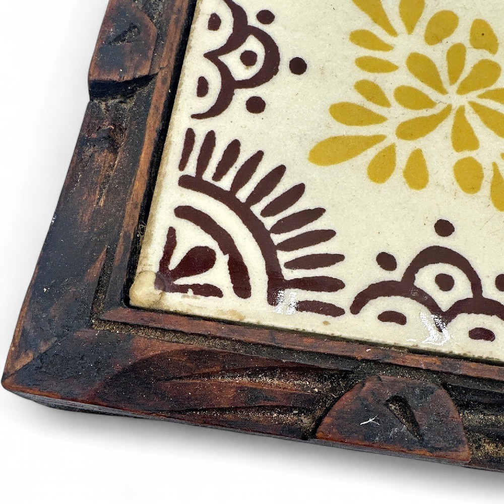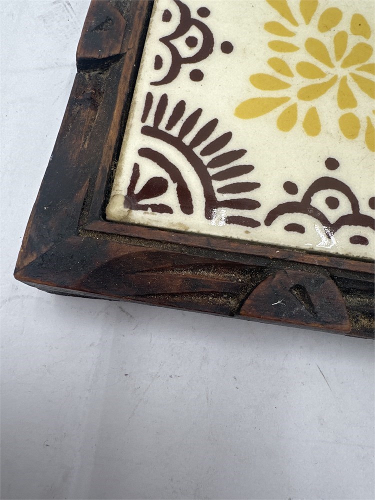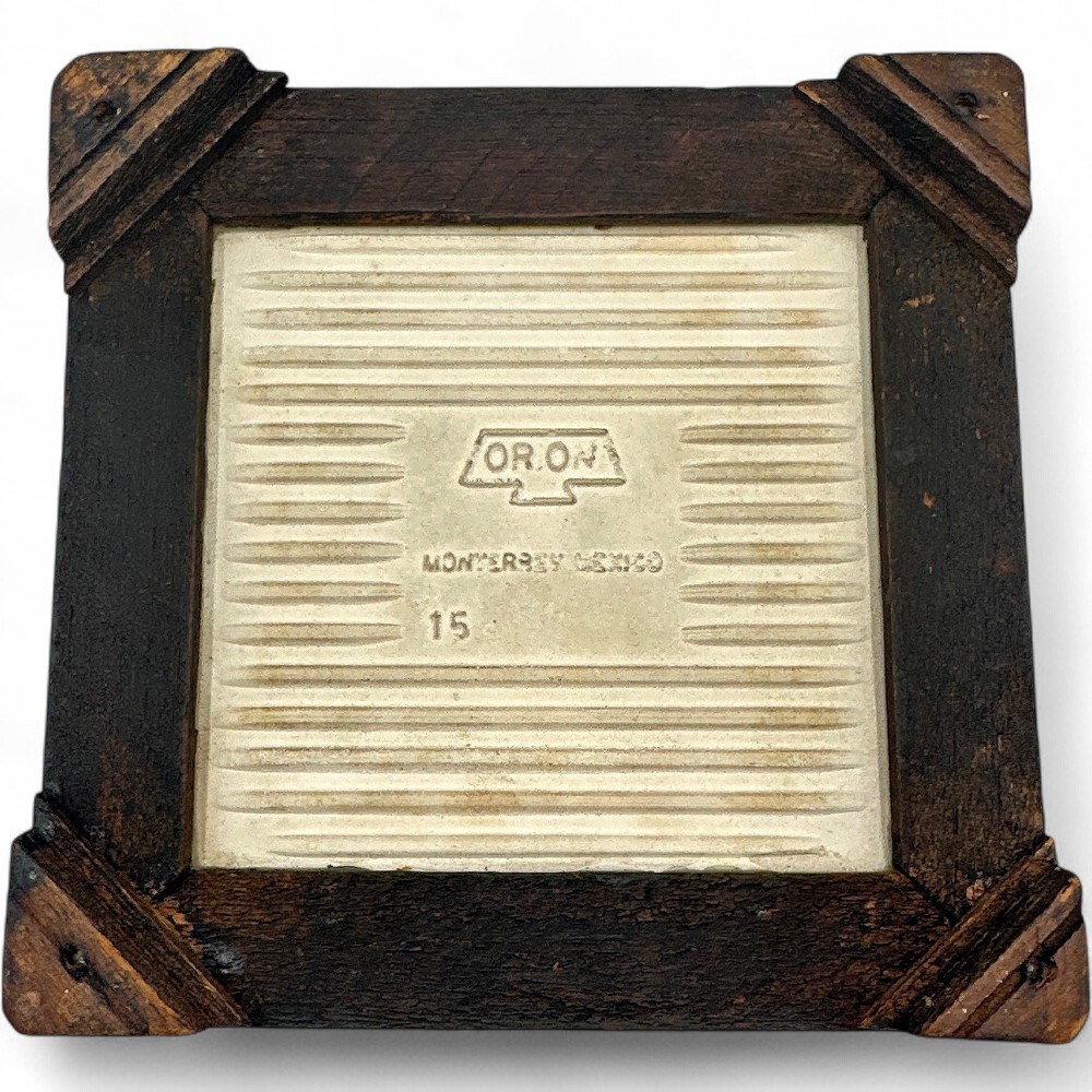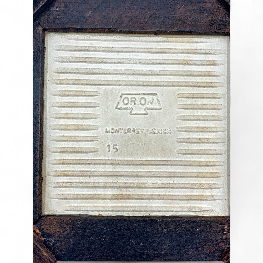A vintage hand-carved teak wood trivet with a brown and white Mexican tile from Orion Monterrey, Mexico. The frame is made of carved teak wood with a dark finish. Trivets like this were popular in the 1970s and often used as hot pads or decorative items. 5.5" W x 5.5" L x 1" H Good condition.