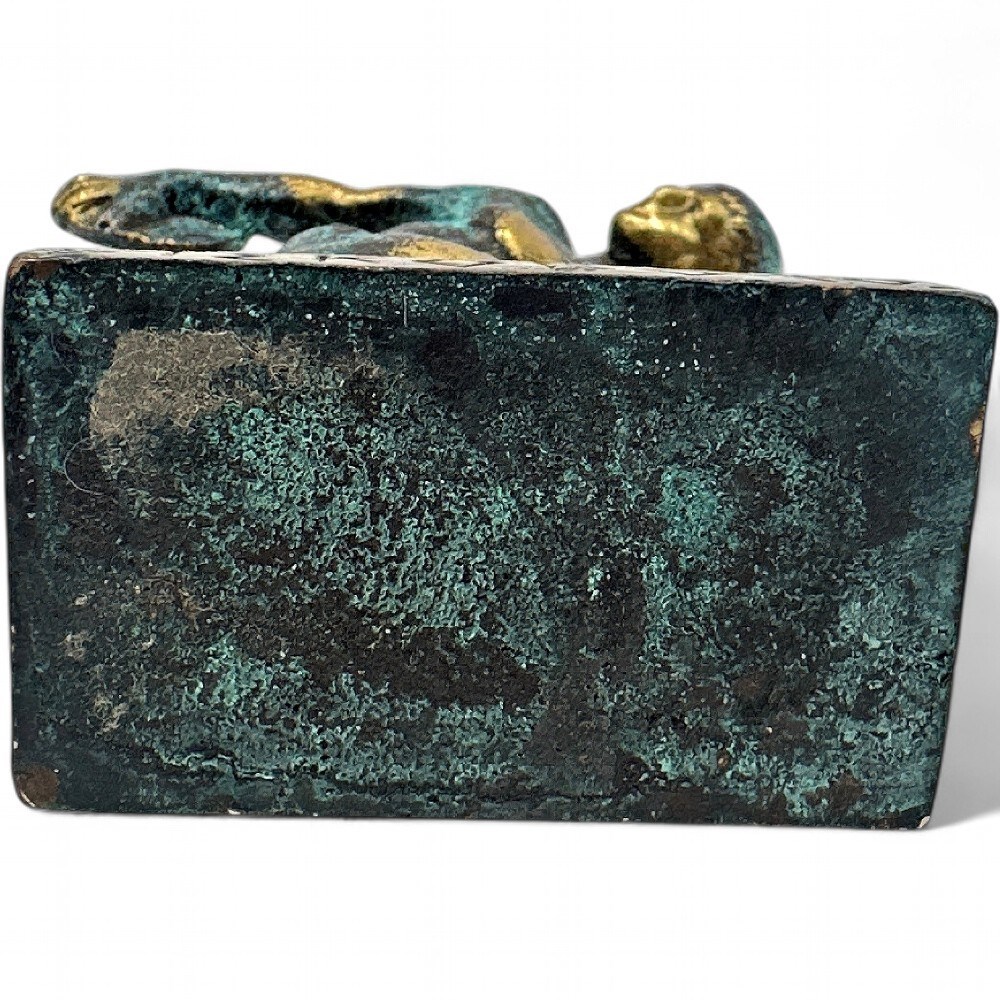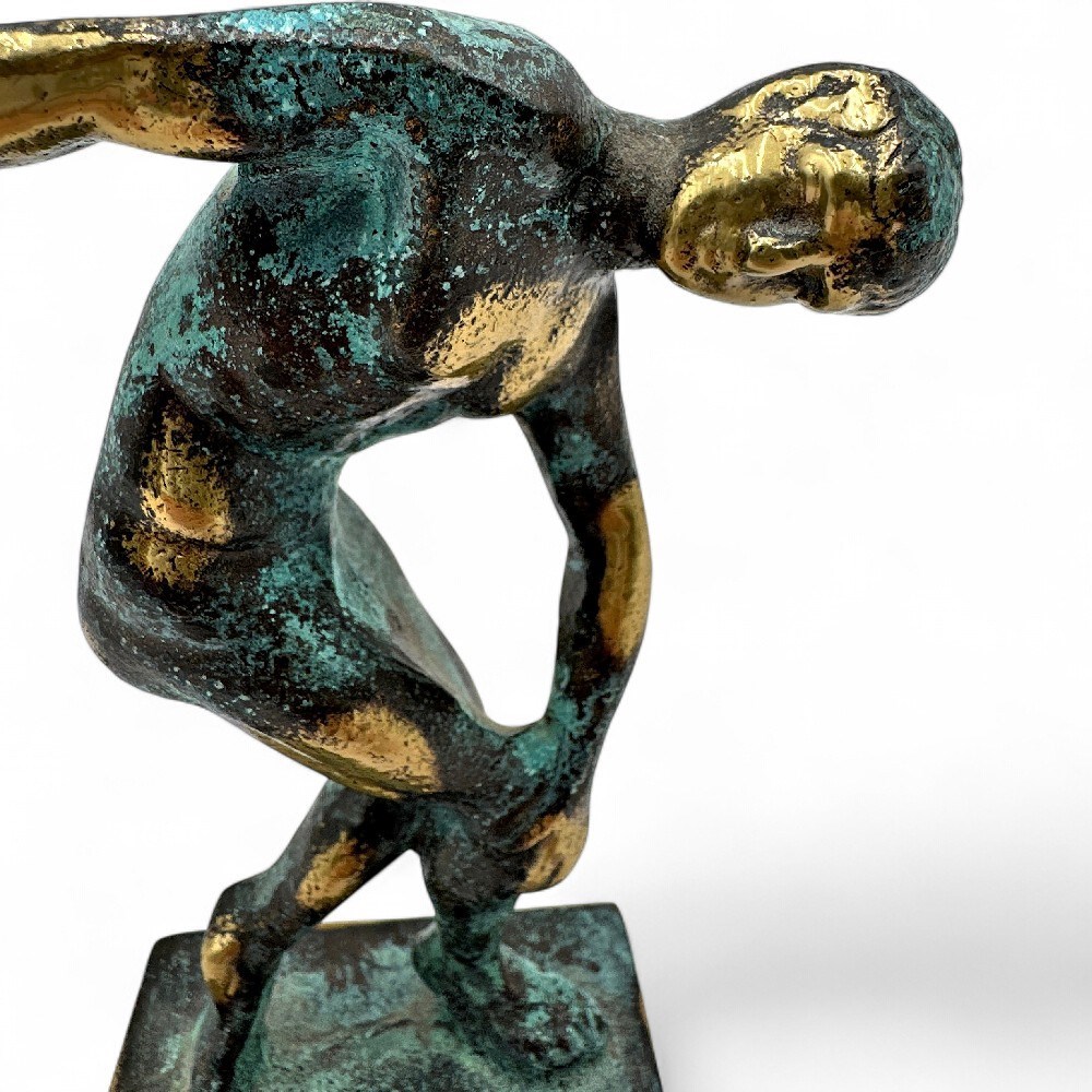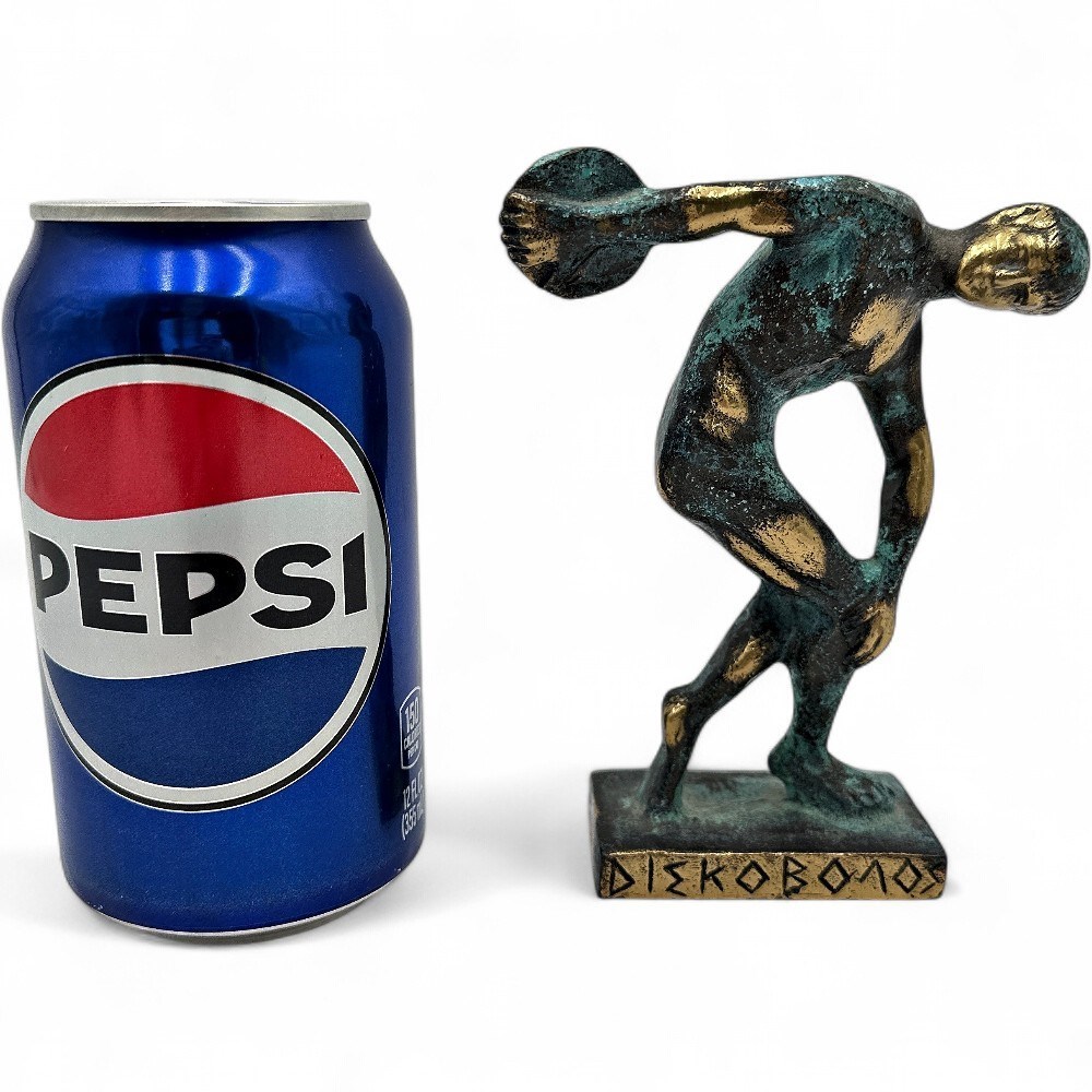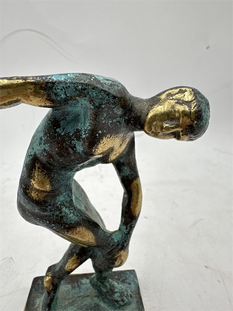 A bronze figurine replica of the ancient Greek sculpture, the Discobolus (Discus Thrower) by Myron. The original bronze sculpture was created around 460-450 BC. The original has been lost and is known today through numerous Roman marble copies. It depicts an athlete in a moment of concentration and poise, preparing to throw a discus. The style is characteristic of the Severe period, known for anatomical detail and a sober expression. 5" H x 2.5" W (base) x 1.5" L (base); 4" (widest point) Good condition.