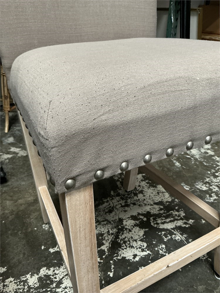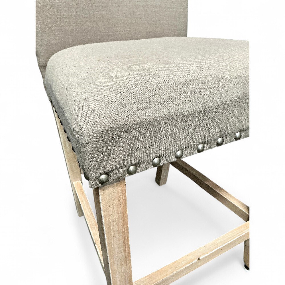 A pair of HomePop counter stools. They have a natural or flax-colored fabric and light wood legs. They are 24-inch counter stools, upholstered, with nailhead trim. They are constructed of a hardwood and plywood frame, with a fabric blend of polyester and acrylic, and feature deep cushioned seat, padded backrest, and nailhead trim along the seat base and back. 18.5" L x 23" D x 39" H Good condition.