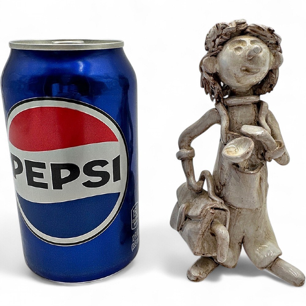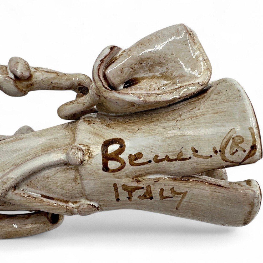 A Dino Bencini Italian ceramic figurine known as the "Traveler". Dino Bencini is a renowned 20th-century Florentine artist known for his whimsical and highly detailed, handcrafted ceramic sculptures. It was handmade in Italy, in the 1960s or 1970s, and is crafted from ceramic and terracotta clay, with a distinctive glaze. The figurines feature a characteristic "spaghetti hair" look and exaggerated, expressive features, which give each character a unique personality. Bencini created a collection of figures depicting various professions and characters, such as doctors, artists, golfers, and, in this case, a traveler carrying a suitcase and cup. 5.5" H x 3" W x 2.5" L Good condition.