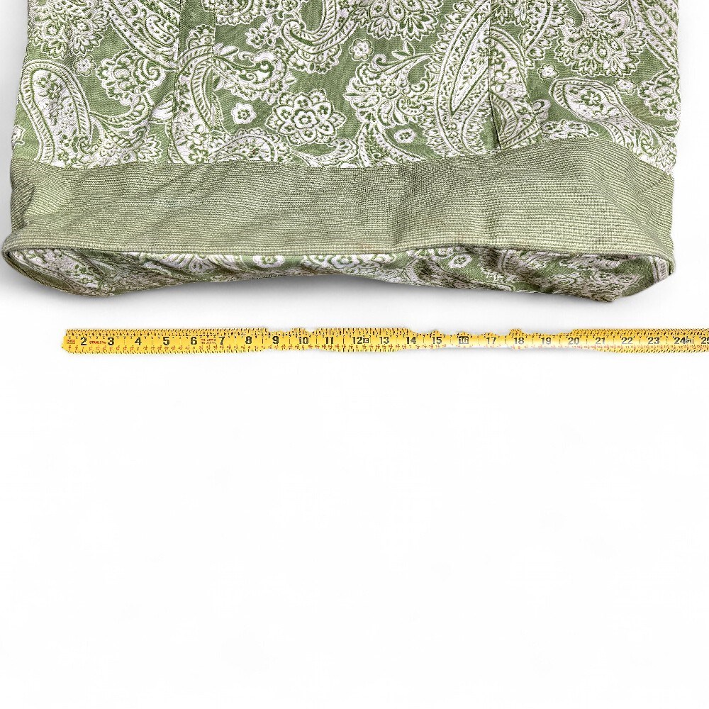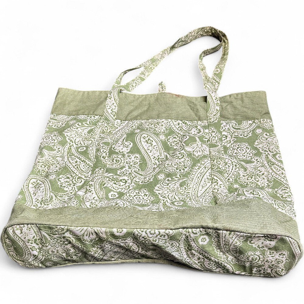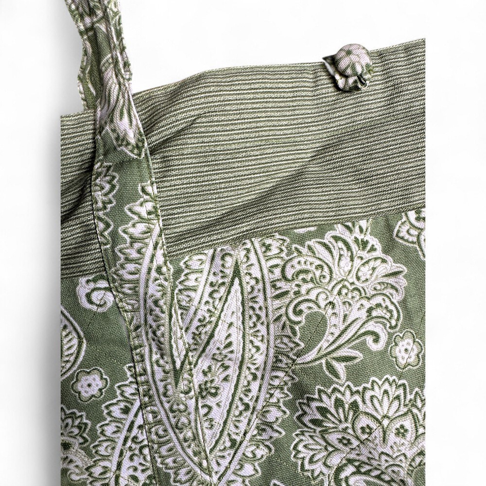 A green paisley cotton tote bag with two handles and loop closure at top. 20.5" H; 34" H (with handles) x 22" W Good condition.