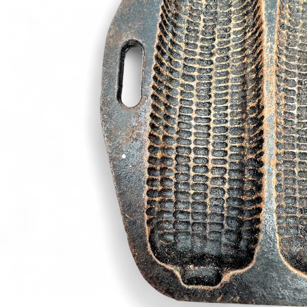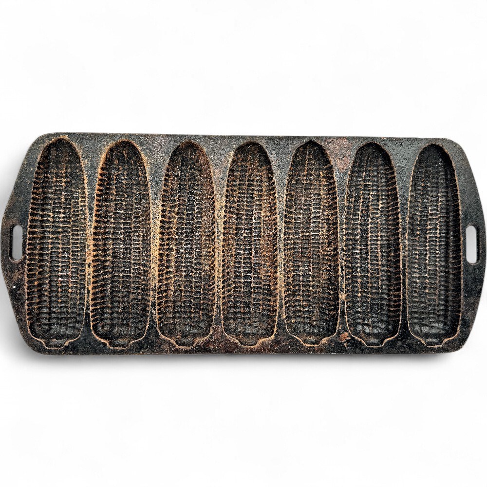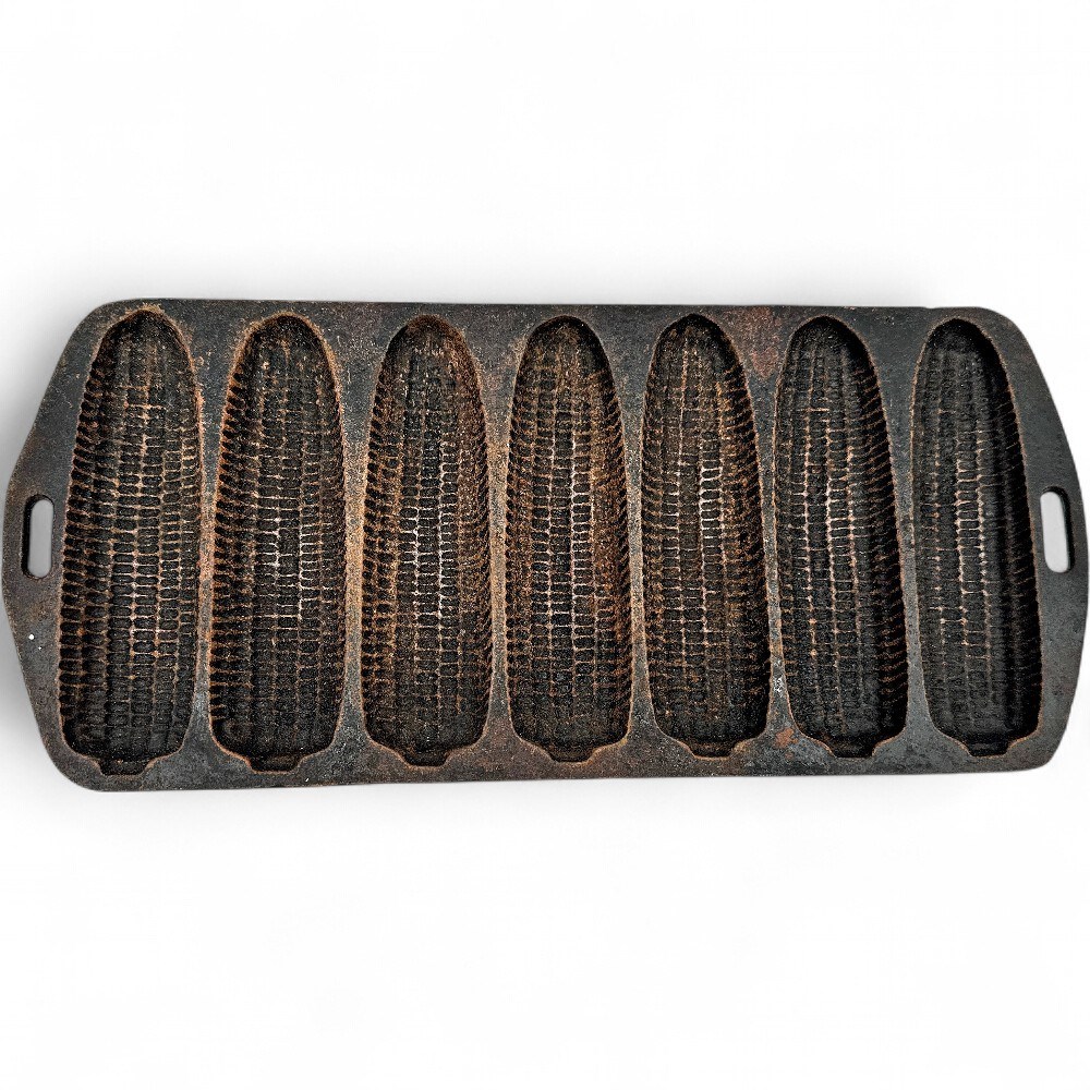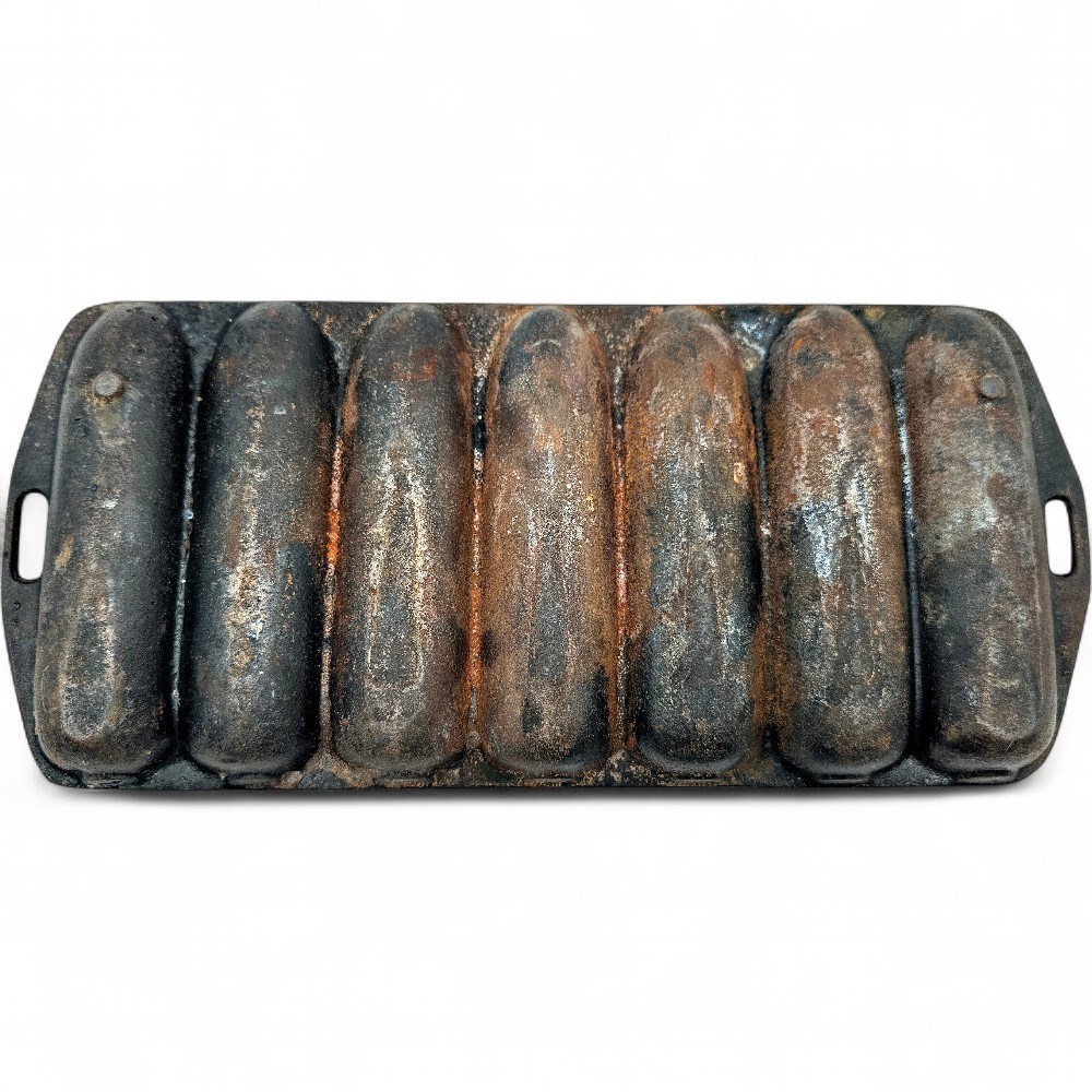 A cast iron cornstick pan, which is a type of bakeware used to make cornbread or other baked goods in the shape of miniature corn cobs. These pans are popular for their ability to create a crispy crust on the entire surface of the cornbread due to cast iron's superior heat retention and even heating. The pan features seven individual, corn-cob-shaped molds (or "impressions") and has small handles on each end for easy handling. It is designed for use in the oven. 12.5" W x 5.5" L Good condition.