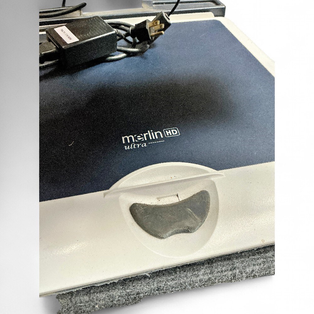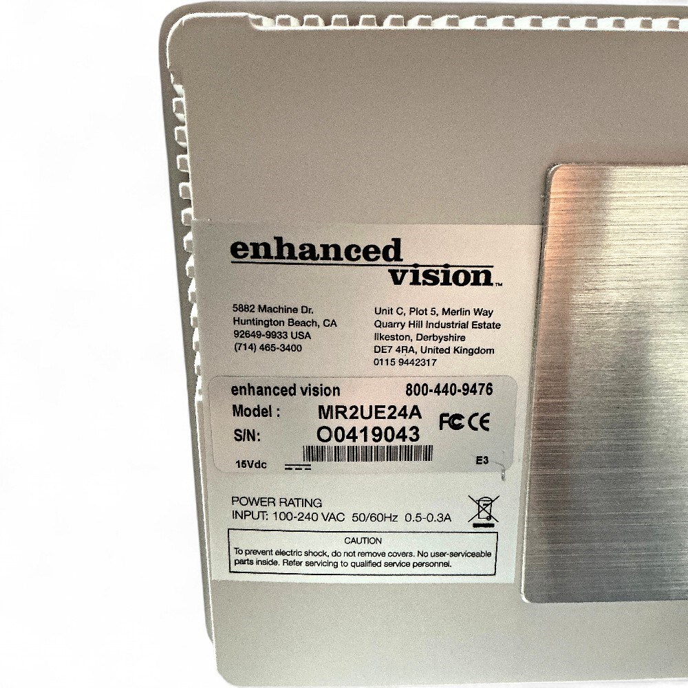 An Enhanced Vision Merlin HD (MR2UE24A) desktop video magnifier. It is a low-vision aid system designed to help individuals with visual impairments to read, write, and view photos and other items. Key features include full color, auto-focus camera system, a high-resolution HD LCD monitor for clear image quality, adjustable magnification, brightness, and color settings. It has a built-in XY table for smooth, continuous reading of documents. 20" L x 24" D x 32" H Good condition.