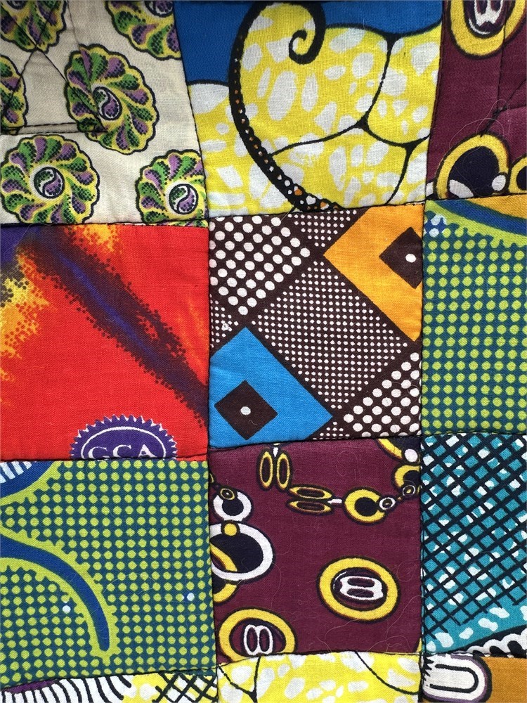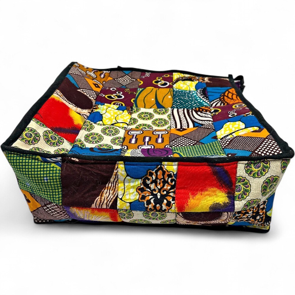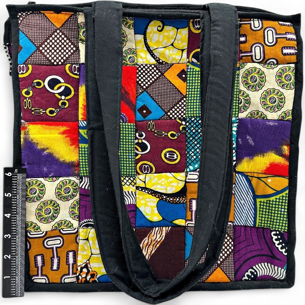 A handmade African print patchwork tote bag. It is a spacious, colorful, and sustainable bag made from square patches of various African wax print fabrics, also known as Ankara or Kitenge fabric. The bag is made from 100% cotton Ankara/Kitenge fabric pieces that are cut and sewn together in a patchwork design. Many similar bags are reinforced for durability and are often fully lined with cotton or upcycled materials. The vibrant colors and diverse traditional patterns give each bag a unique, Afrocentric, and boho style. It functions as a versatile tote or shoulder bag for everyday use, with some designs including a zipper closure and interior pockets. It can be used for shopping, an overnight trip, carrying books, or as a statement accessory. 14" H; 28.5" H (with handles) x 14" W Good condition.
