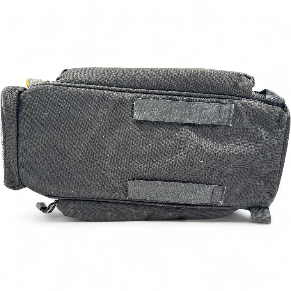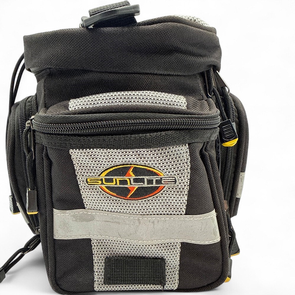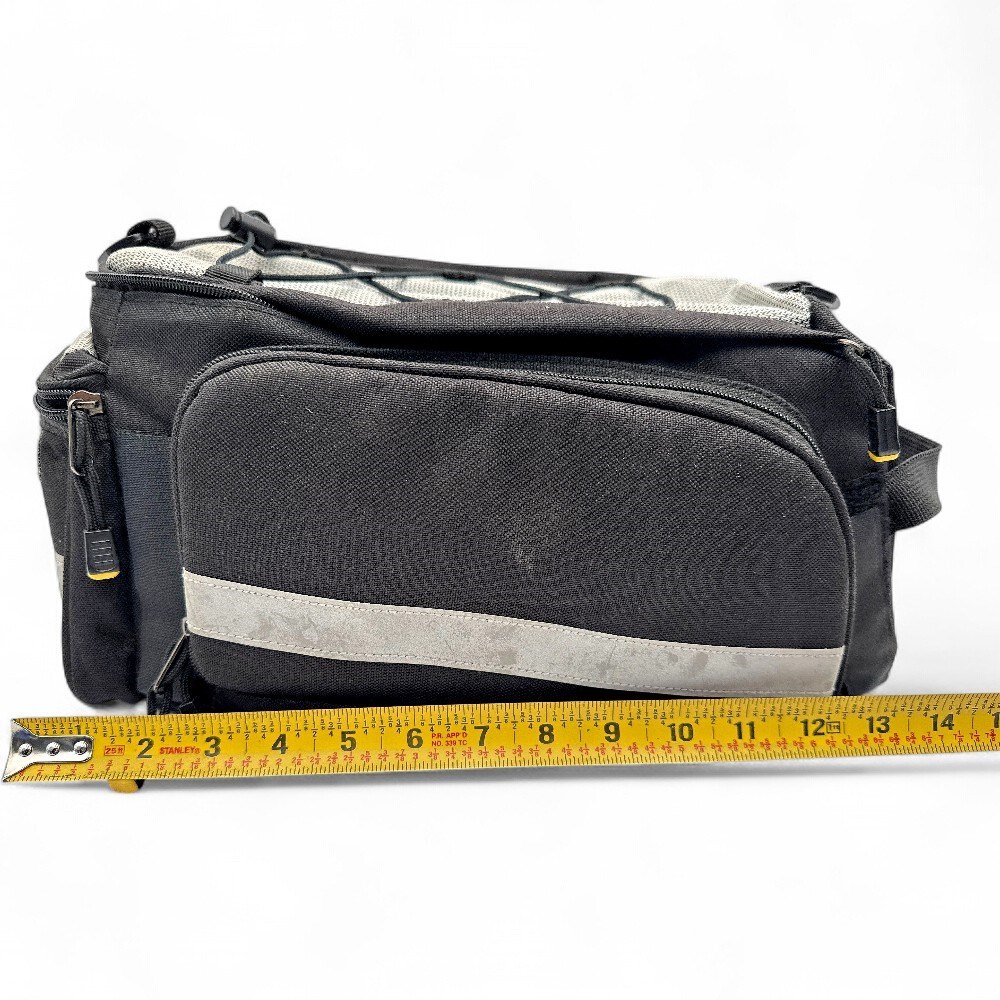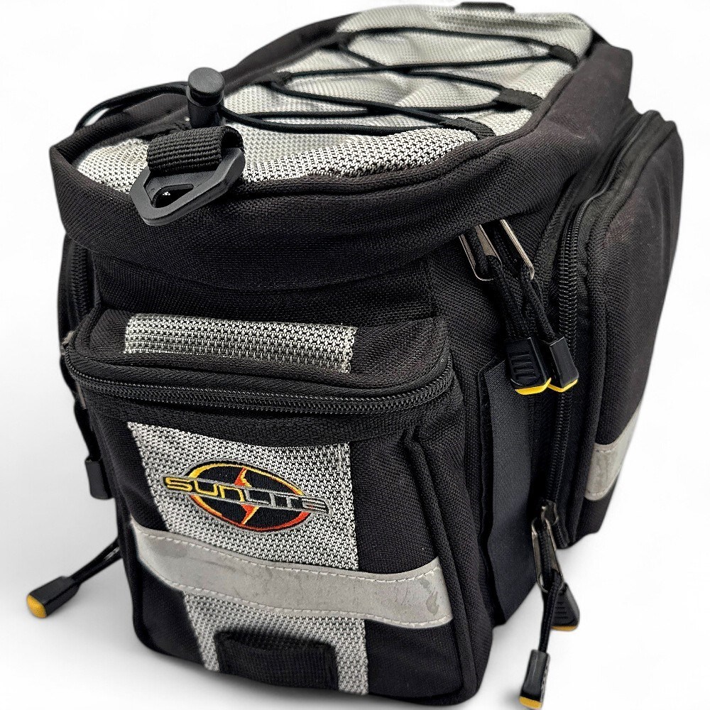 A Sunlite Utili-T Rack Bag. It is constructed from water-resistant 600-denier polyester material. The bag is a trunk-style bag designed to mount on a bicycle's rear rack. It features an insulated main compartment, side pockets, and an elastic bungee cord system on top for additional storage. It includes reflective trim for enhanced safety and visibility during night rides. The bag has a carrying handle and may also include a removable shoulder strap for off-bike use. H: 7" W: 15" L: 9" Good condition.