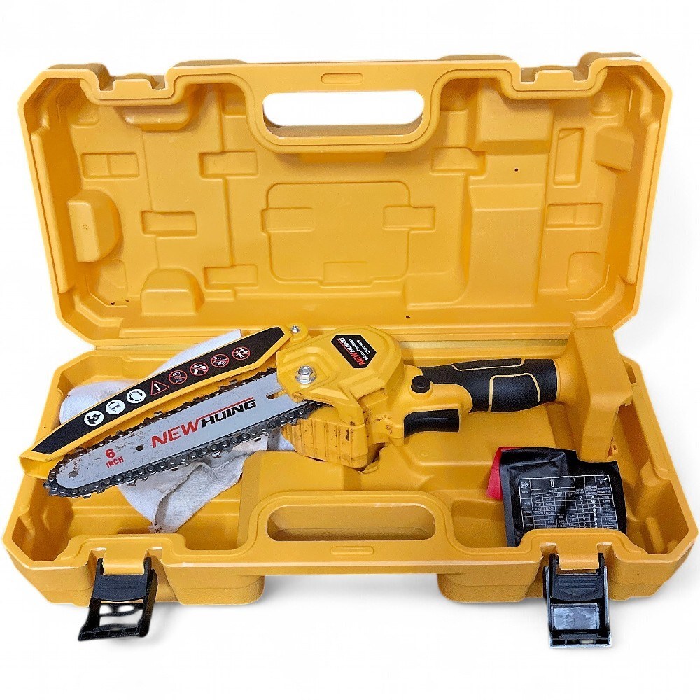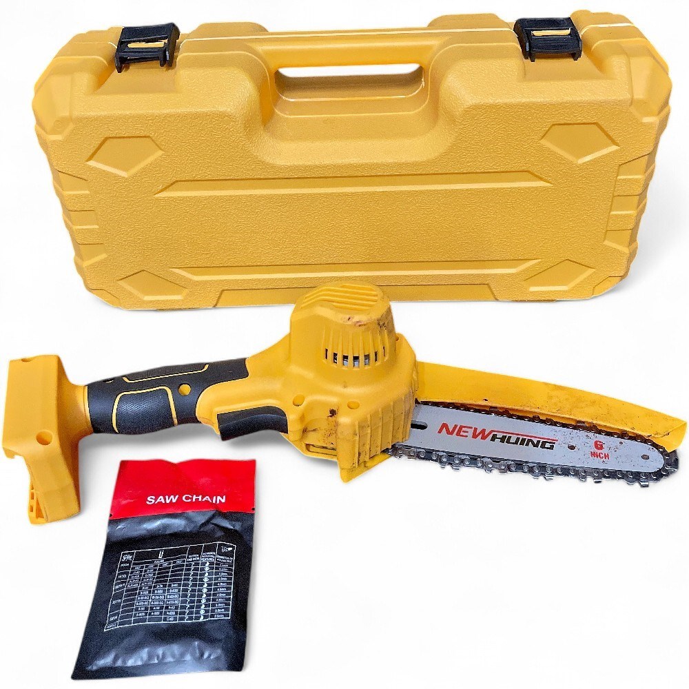 A New Huing 6-inch cordless mini chainsaw kit. It is a battery-powered, one-handed electric saw designed for light-duty tasks like tree trimming and branch cutting. The kit includes the saw, two 21V lithium-ion batteries, a charger, two chains, and tools, all stored in a yellow carry case. It features a powerful brushless motor and an automatic oiling system for continuous lubrication. The compact and lightweight design makes it suitable for accessing tight spots where larger chainsaws would not fit. Case L: 16" W: 7 1/2" D: 6" Good condition.