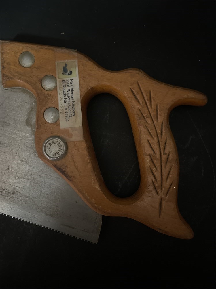A vintage Craftsman cross-cut hand steel saw with a wood handle. The handle is hardwood with a "wheat" pattern carving, which often indicates a higher-quality model. L: 29" W: 6 1/2" Good condition.