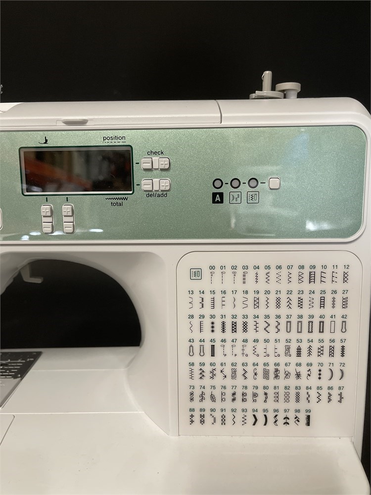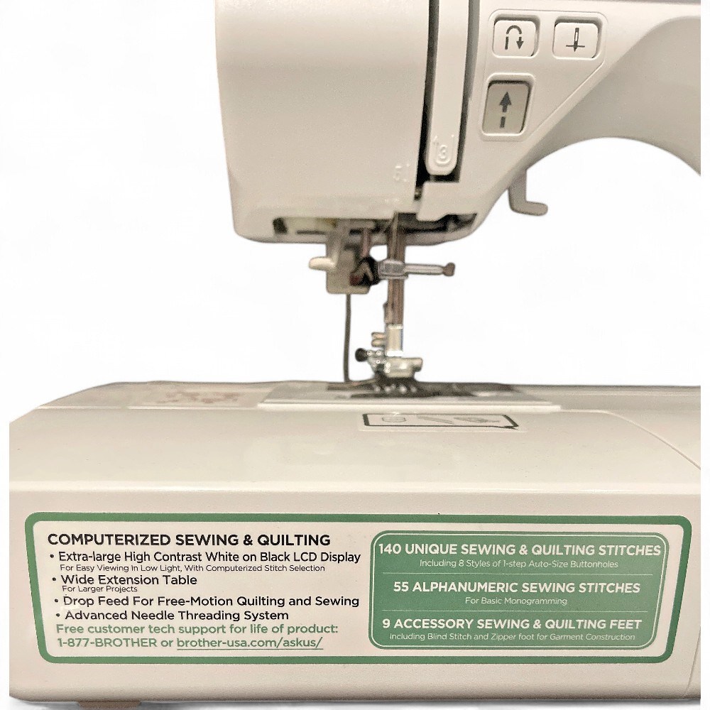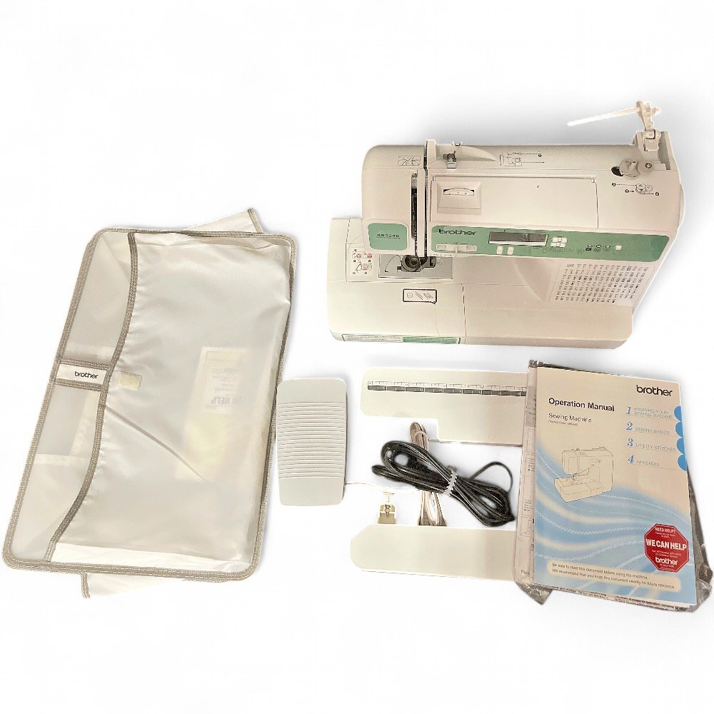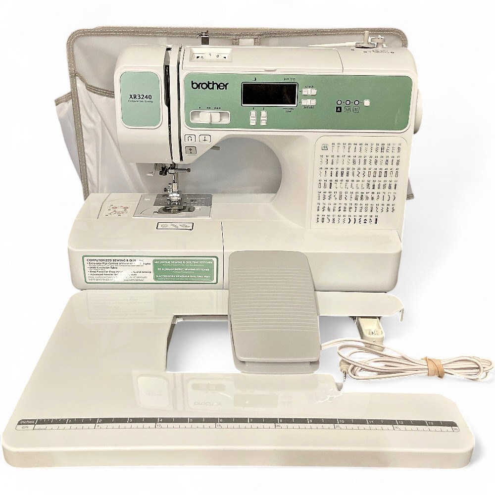 A Brother XR3240 computerized sewing & quilting machine. It features 140 built-in sewing stitches, including 8 styles of one-step auto-size buttonholes. It includes a sewing lettering font with 55 alphanumeric characters for basic monogramming, and comes with a detachable wide table, making it suitable for larger projects. It is equipped with an extra-large LCD display screen for easy viewing. L: 20" H: 12 1/2" D: 9 1/2" Good condition.