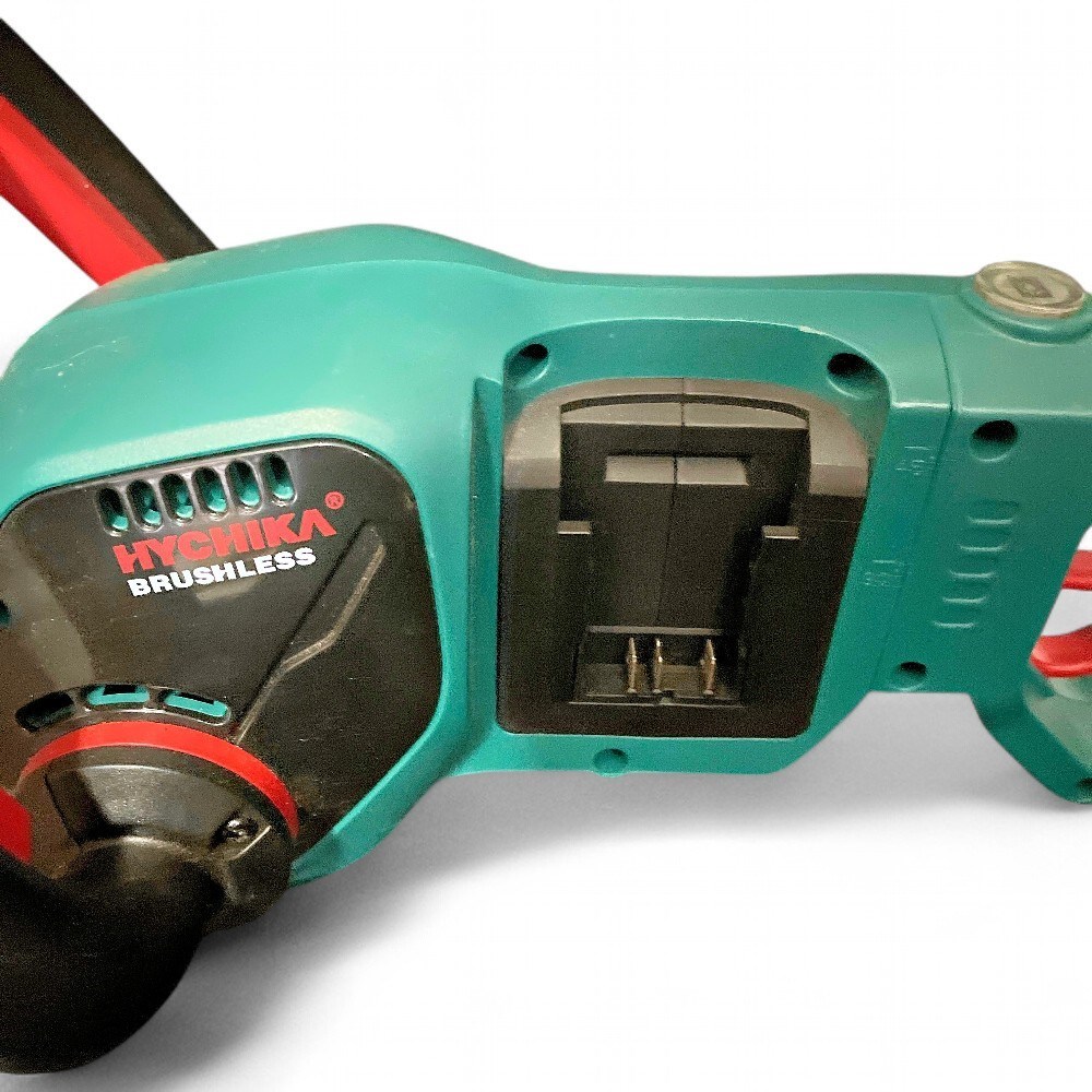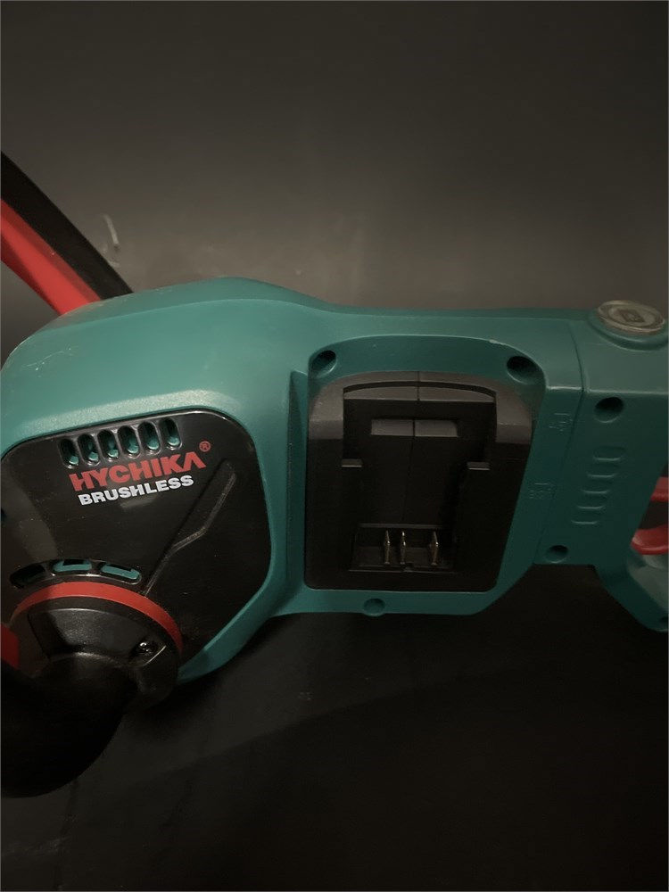 A Hychika cordless hedge trimmer (Model HT40B). It has a 40V Max (nominal 36V) Lithium-ion battery system. (Battery not included) and a blade length of 24 inches. L: 47" H: 8 1/2" W: 9" Good condition- no battery or charger.