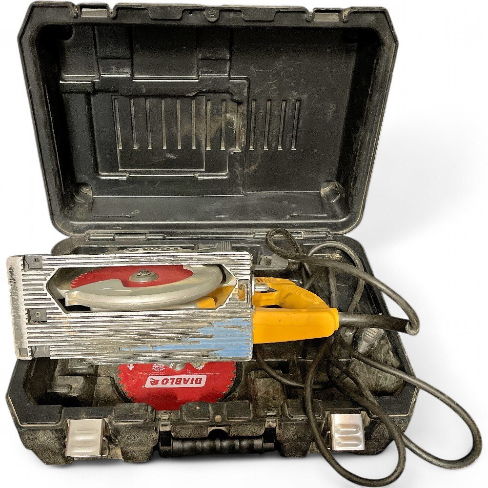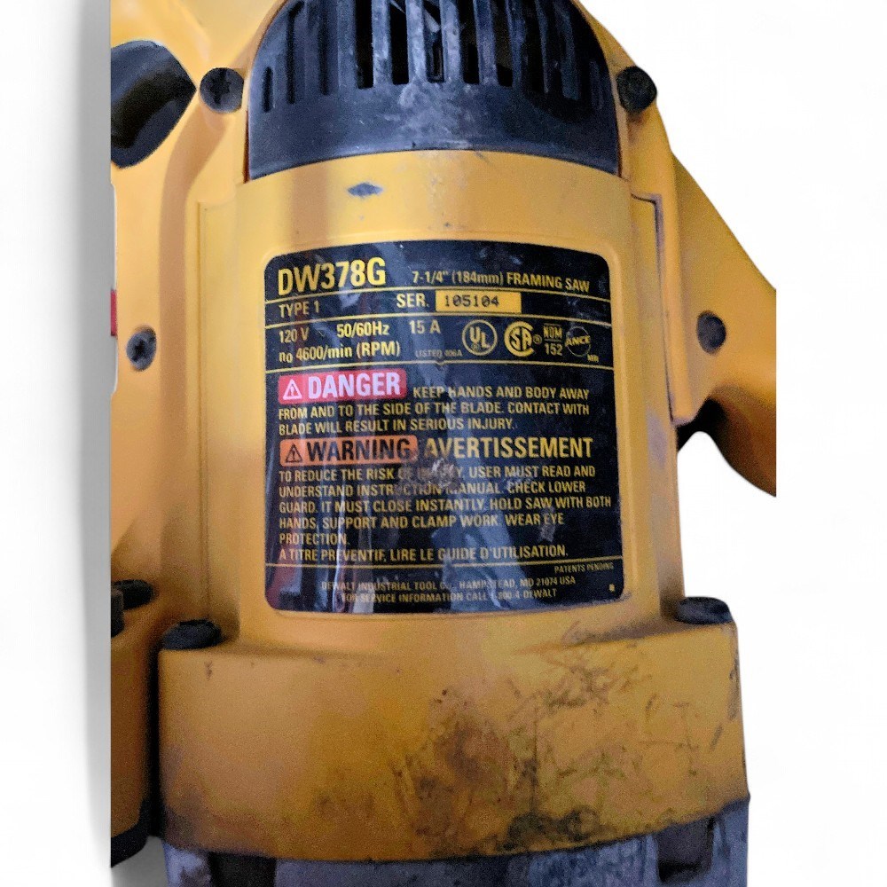 A DeWalt DW378G 7-1/4" framing saw. It is a corded electric circular saw known for its high-torque motor and lightweight design. Comes with case. DeWalt Case L: 19" W: 14 1/2" D: 9" Good condition.