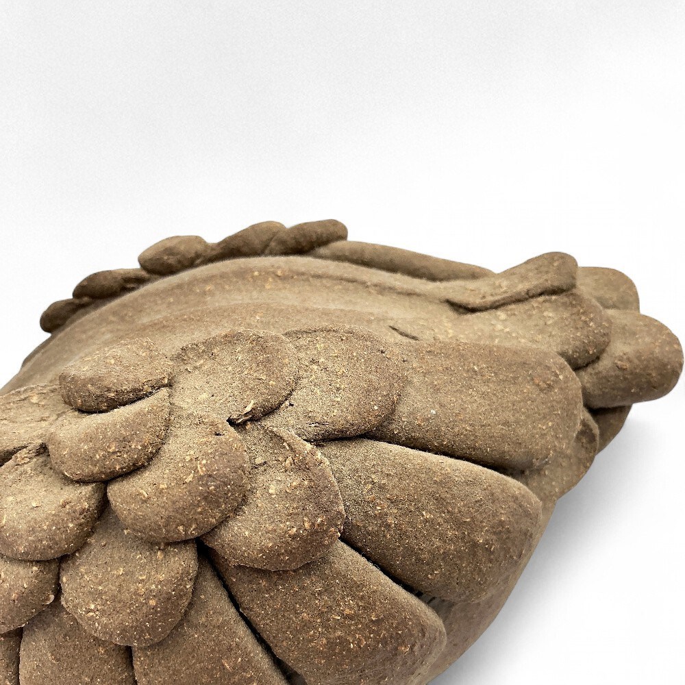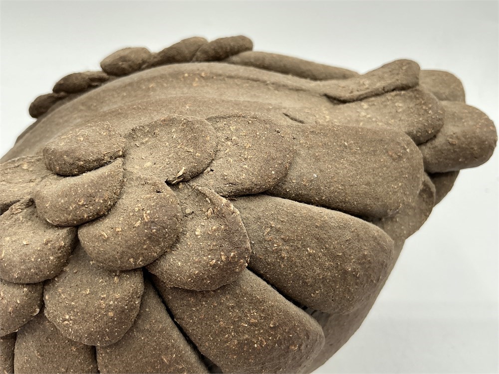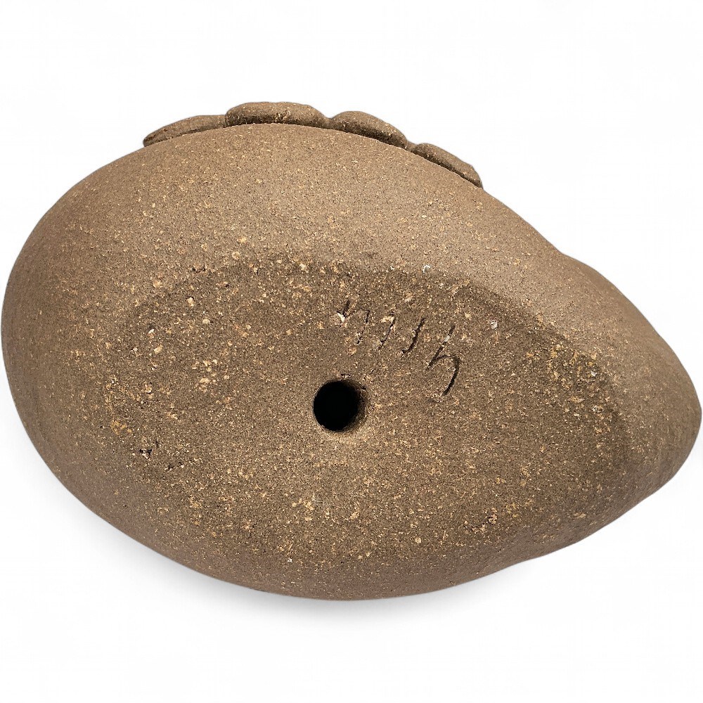 A handmade ceramic swan or duck figurine from the Earth Arts Studio collection by the late artist Margaret Hudson. This specific design appears to be part of a "Duck Planter" line, known for its rustic, earthy style and textured feather details. It was designed by Margaret Hudson and hand-sculpted by artisans at her Earth Arts Studio in Fresno, California. It is made from high-fired stoneware clay, which gives it durability and its natural, unglazed brown color and texture. The piece embodies a folk art or rustic style, celebrating the wildlife found in California's Central Valley. The textured feather detailing is a signature characteristic of these pieces. W: 6" H: 6" Good condition.