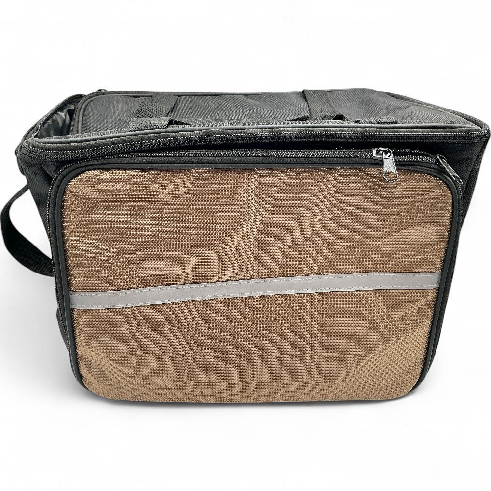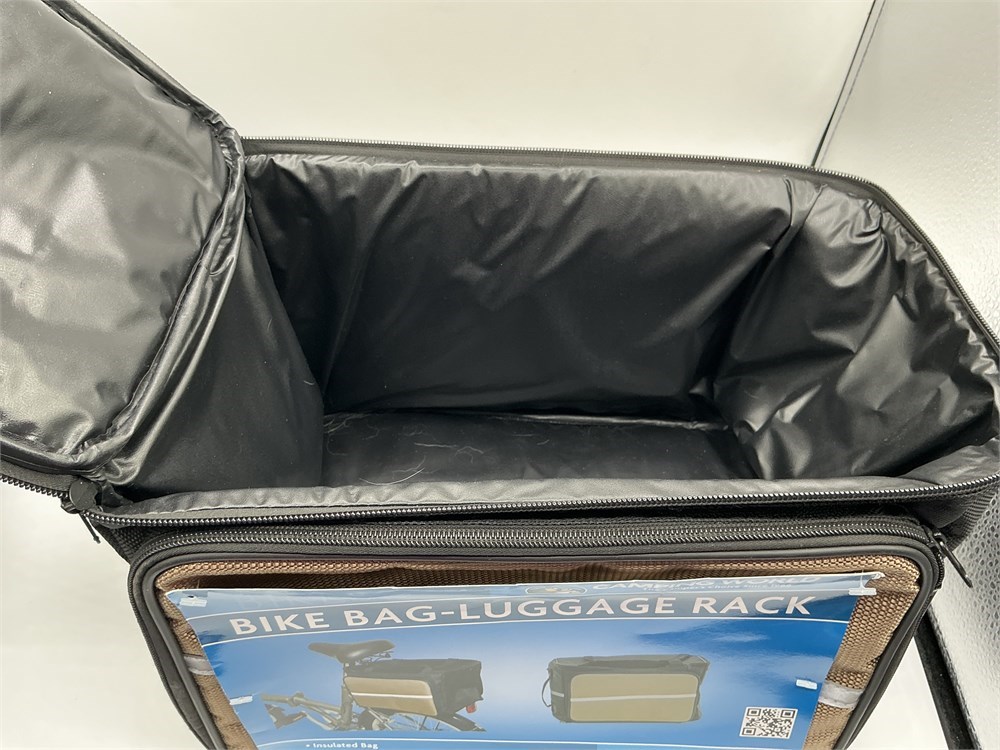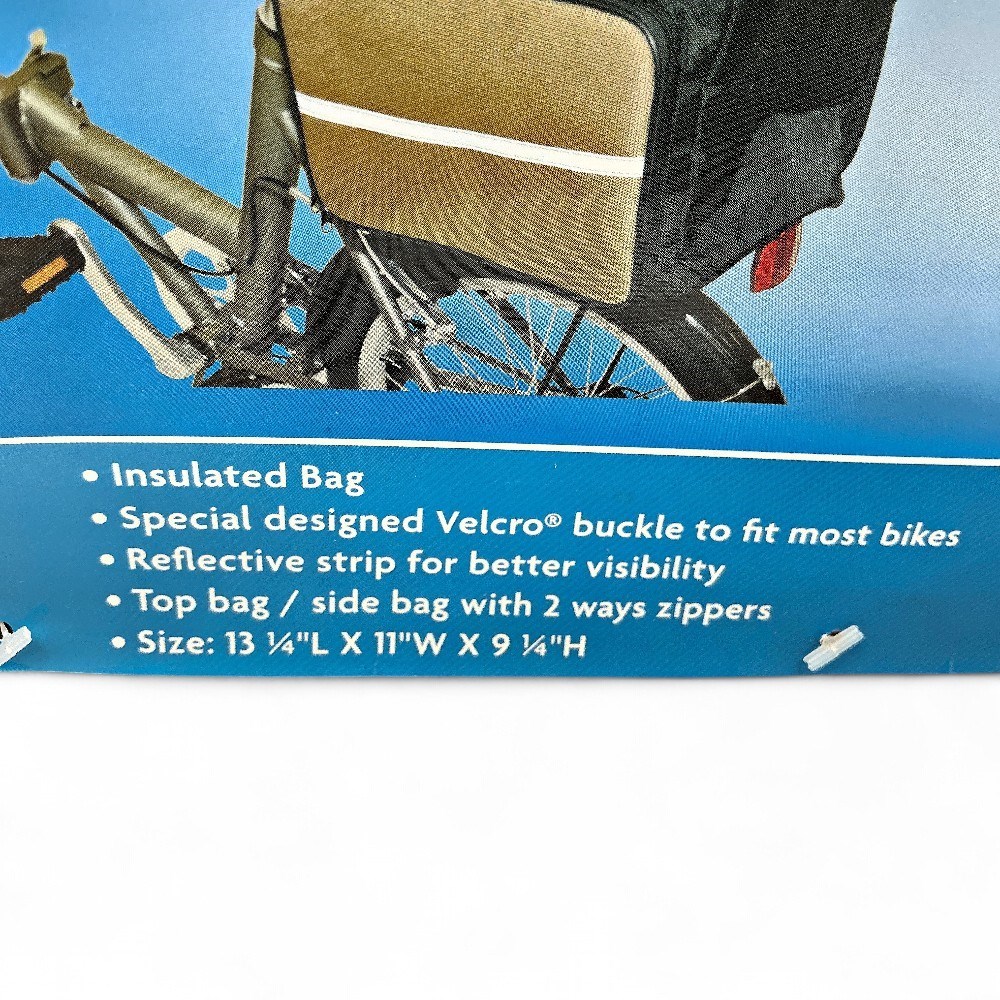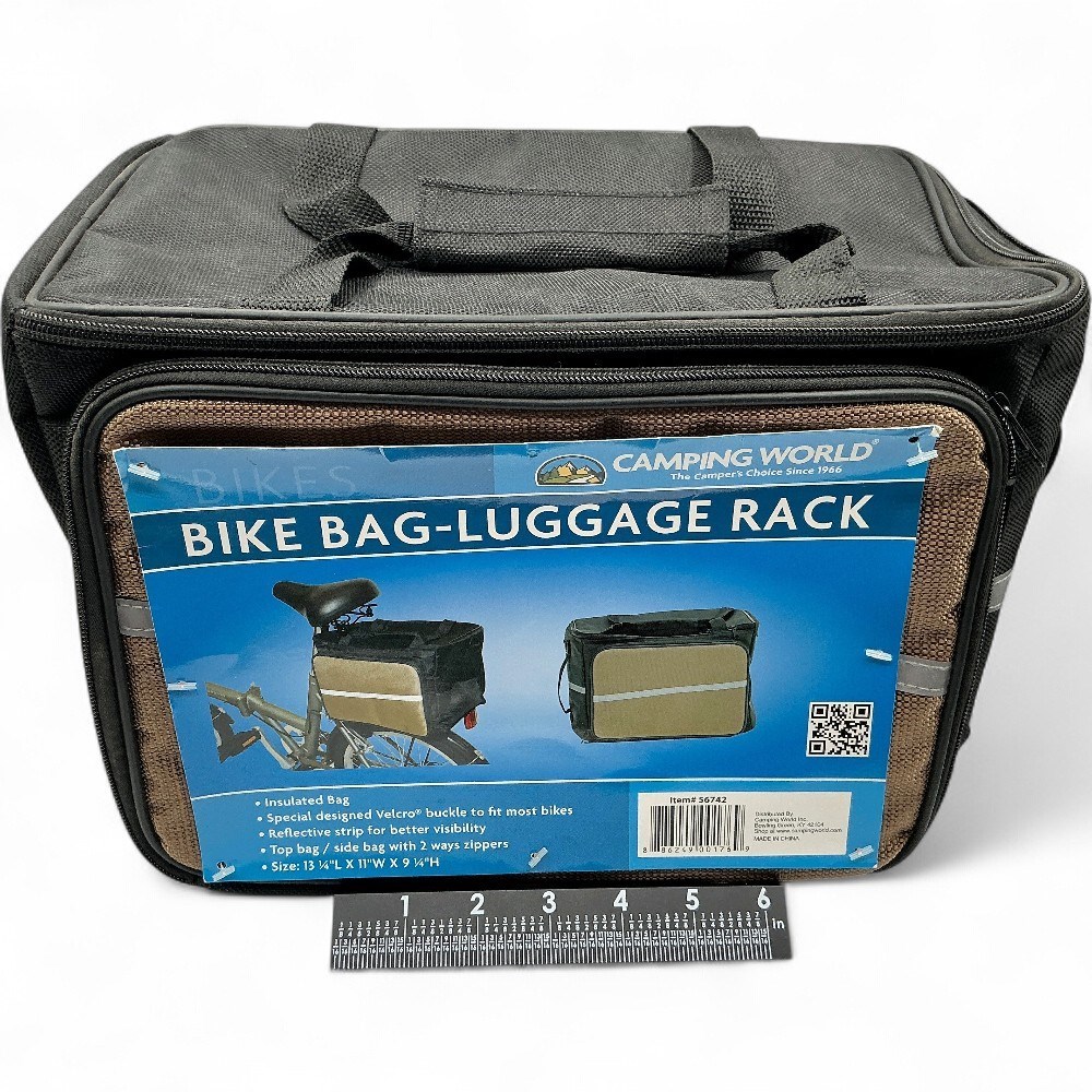 A Camping World bike bag-luggage rack. It is an insulated bag with a specially designed Velcro buckle to fit most bikes. A reflective strip is included for better visibility. The top and side bags have 2-way zippers.L: 13.25 " W: 11" H: 9 1/4" Good condition.