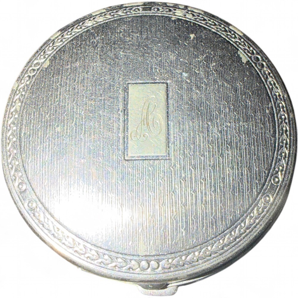 A vintage Richard Hudnut Deauville powder and rouge compact, produced in the 1920s. It is a collectible item, featuring an engine-turned design and a cartouche for initials. Case is inscribed with initials. The compact is silver-toned metal and has an Art Deco design. 2" Good condition.