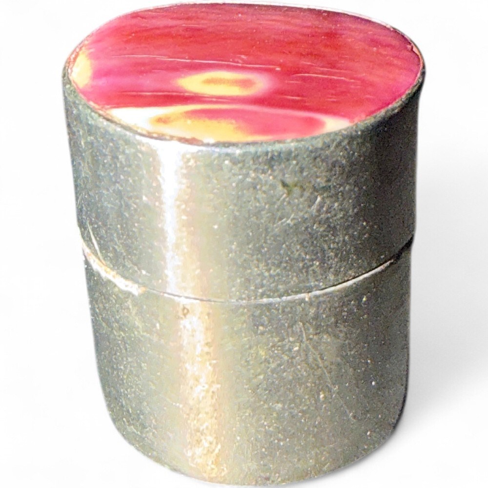A small round pill or trinket box, made of brass , featuring a lid with a red and pink marbled enamel inlay. This type of small, decorative container was historically used as a pill box, snuff box, or a small trinket/ring box. H: 1" Good condition.