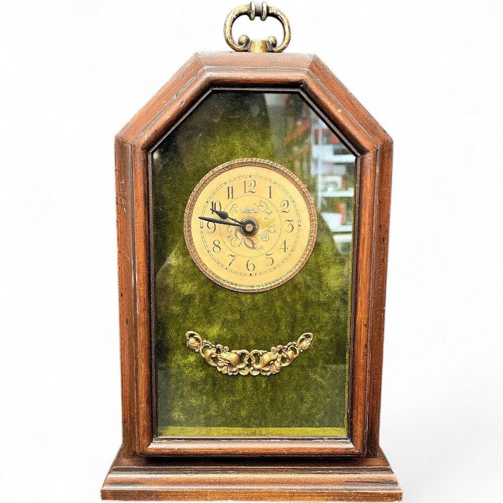 A vintage Wuersch mantel clock, from the 1970s or later. Robert F. Wuersch, a Swiss-born artisan, founded the Wuersch Manufacturing Clock Company in Fall River, Massachusetts, in the 1960s. The company operated until Wuersch's death in 1995. The clock has a wooden case of espresso-colored hardwood, featuring an octagonal top and a wide beveled base. It features a round, gold-tone face with Roman numerals, set against a distinct green velvet or felt background visible through the glass front. A decorative, ornate brass-toned accent piece is affixed to the green background below the clock face. 13 1/2" H x 3" L x 8" W Good condition.