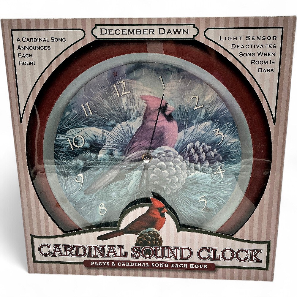 A Mark Feldstein & Associates cardinal sound clock. The clock features a winter scene graphic reproduction from the "December Dawn" or "Winter Light" painting by renowned artist Rosemary Millette. The clock announces each hour with an authentic cardinal song recording. A built-in light sensor automatically deactivates the sounds when the room is dark. It is an analog clock, designed for wall or tabletop display. D: 13" New in original box.