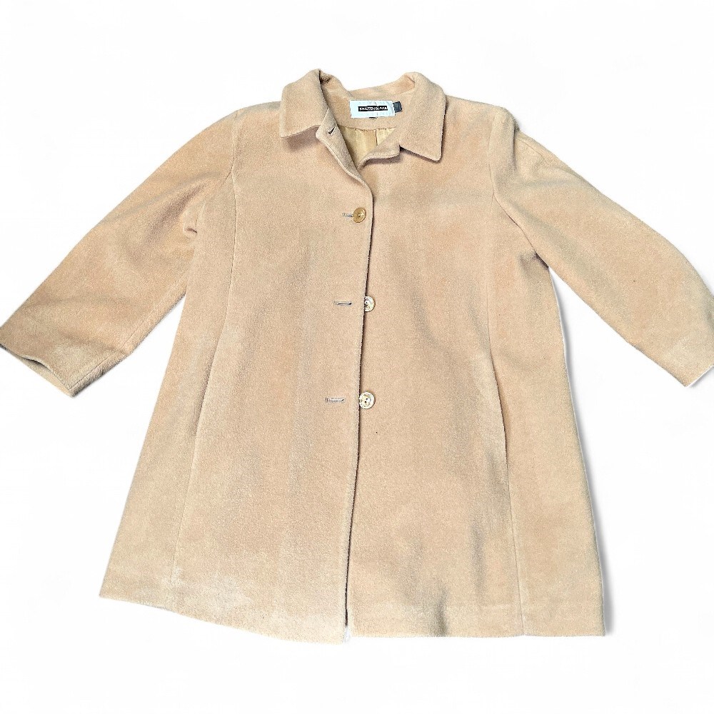 A Kristen Blake brand coat. Kristen Blake is a fashion brand that offers sophisticated apparel, known for using fine materials like wool and cashmere blends in their outerwear. The coat in the image is a beige or camel colored, single-breasted, mid-length walking coat with a collar and button closure. Length 36” Good condition.