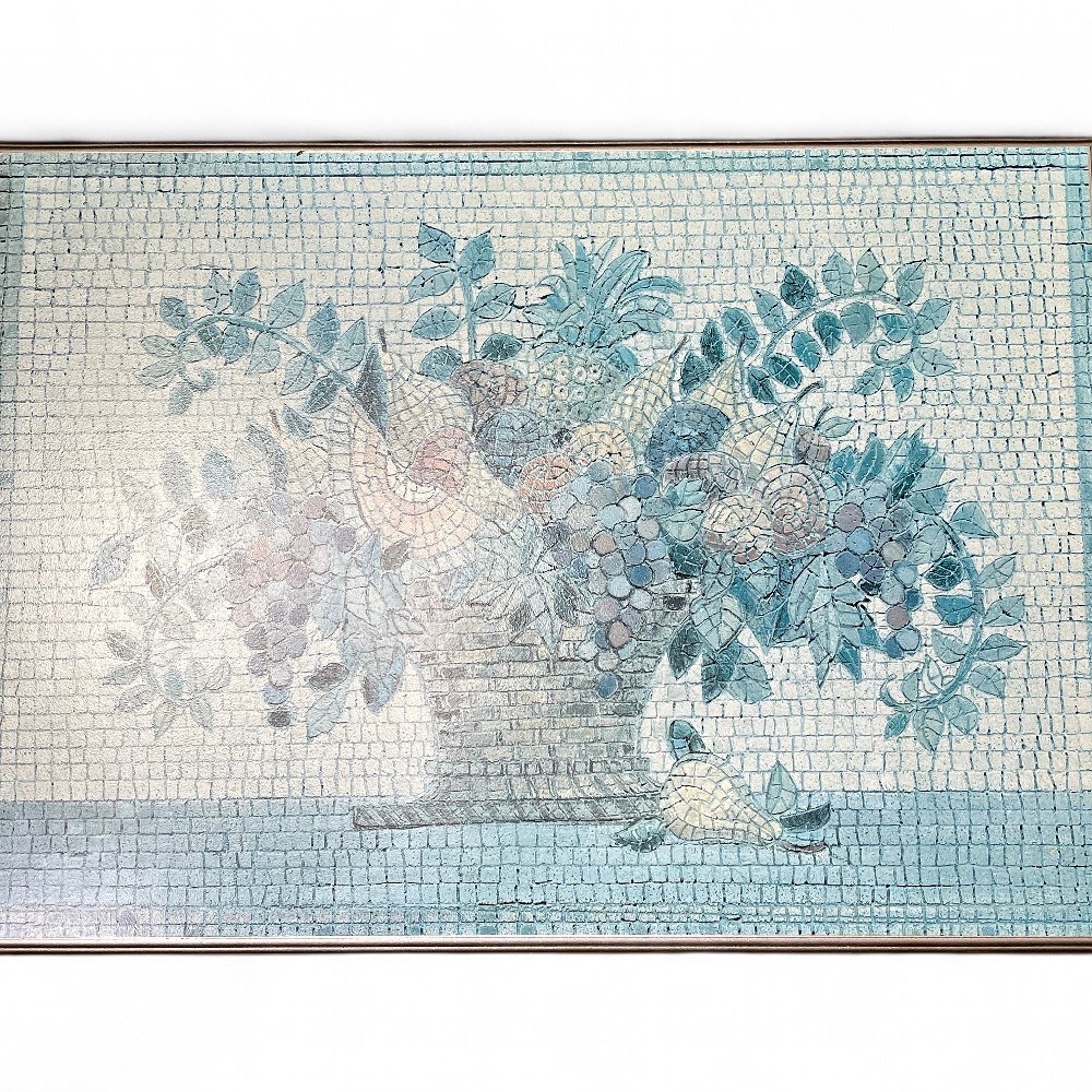 A still-life mosaic artwork depicting a floral and fruit arrangement in a vase. Mosaics are created from small, hand-cut pieces of material like glass, tile, or natural stone, which are held in place by mortar or plaster. The piece uses a muted color palette, primarily shades of blue and white, to create the image of a large, lush bouquet. The technique allows for variations in color and texture to define different elements, such as the leaves, grapes, and flowers. Mosaic wall art is a durable form of artistic expression used for decorating walls in various settings, including homes and outdoor spaces. 34”x24” Good condition.