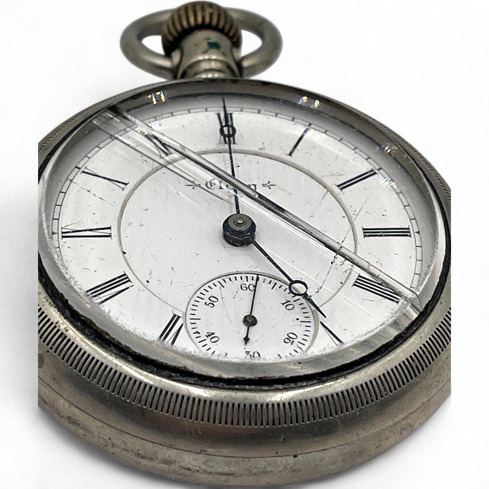 An Elgin open-face model pocket watch, identifiable by the name "Elgin" on the dial, which was a common feature until the late 1960s. It appears to be an antique or vintage timepiece, likely from the late 19th or early 20th century, a period when Elgin National Watch Company was a major American watchmaker. It hasa white dial with black Roman numeral hour markers and a sub-seconds dial at the 6 o'clock position, a common style for their watches. The case has a textured, reeded edge and appears to be a silver-toned metal, possibly coin silver, "silverode," or base metal, as Elgin cases were often made by third parties like the Illinois Watch Case Company. 3” x 2” Please note: The watch crystal is cracked, and the dial shows signs of wear and hairline fractures.
