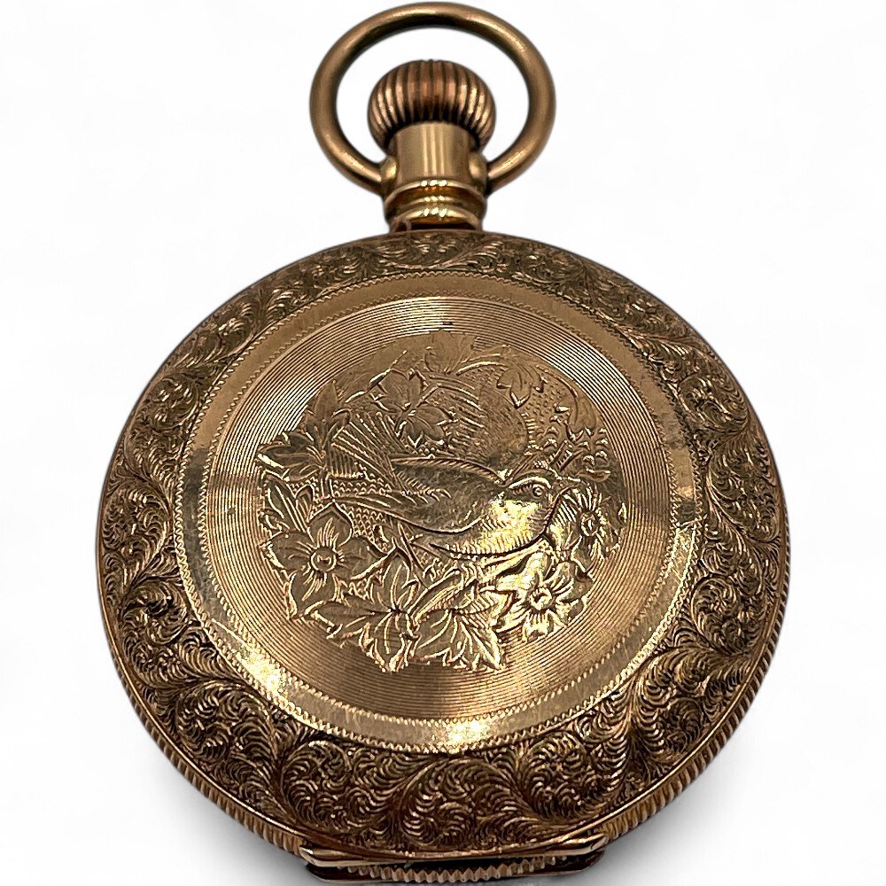 An antique Columbus hunter-case pocket watch, likely produced between the 1880s and early 1900s by the Columbus Watch Company. The company operated under various names in Columbus, Ohio, from 1874 until its acquisition by the South Bend Watch Company in 1903. This is a "hunter" style case, which features a hinged cover that protects the crystal and dial. The decorative engraving is characteristic of American-produced pocket watches of that era. The watch features a white porcelain or enamel dial with black Roman numeral hour markers, "spade" style hands, and a subsidiary seconds dial at the 6 o'clock position. Columbus produced watches with varying jewel counts, ranging from 7 to 25 jewels, many of which were considered high-grade and suitable for railroad time service. 1 1/2” x 2” Good condition.