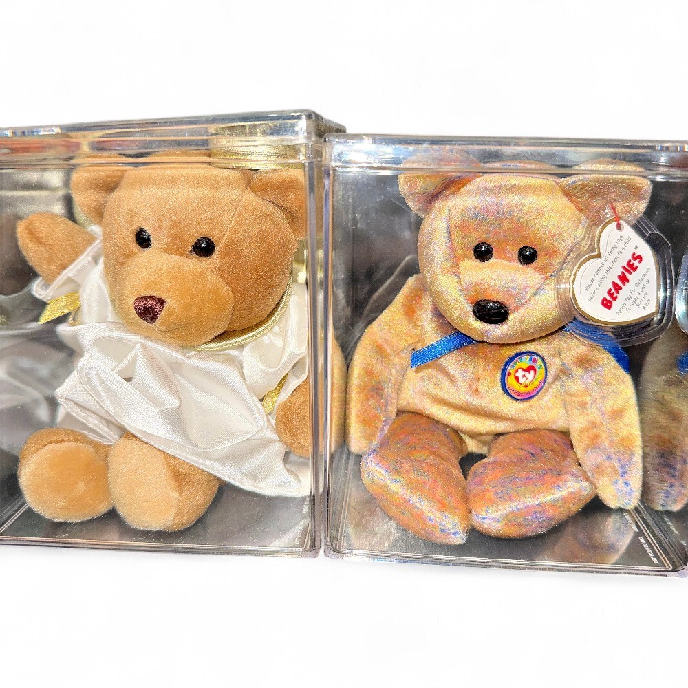 Two Ty Beanie Baby and Beanie Buddies Clubby III bears, which were released in 2000 as a gift set for the Beanie Baby Official Club (BBOC). Clubby III Beanie Baby: The smaller bear on the right is the standard Beanie Baby version, featuring golden-brown fur and a blue ribbon. Clubby III Beanie Buddy: The larger bear on the left is the Beanie Buddy, which is a larger, plush counterpart to the Beanie Baby, wearing a white and gold-trimmed cloak. Both bears were introduced on June 30, 2000. 1/2" H Good condition.