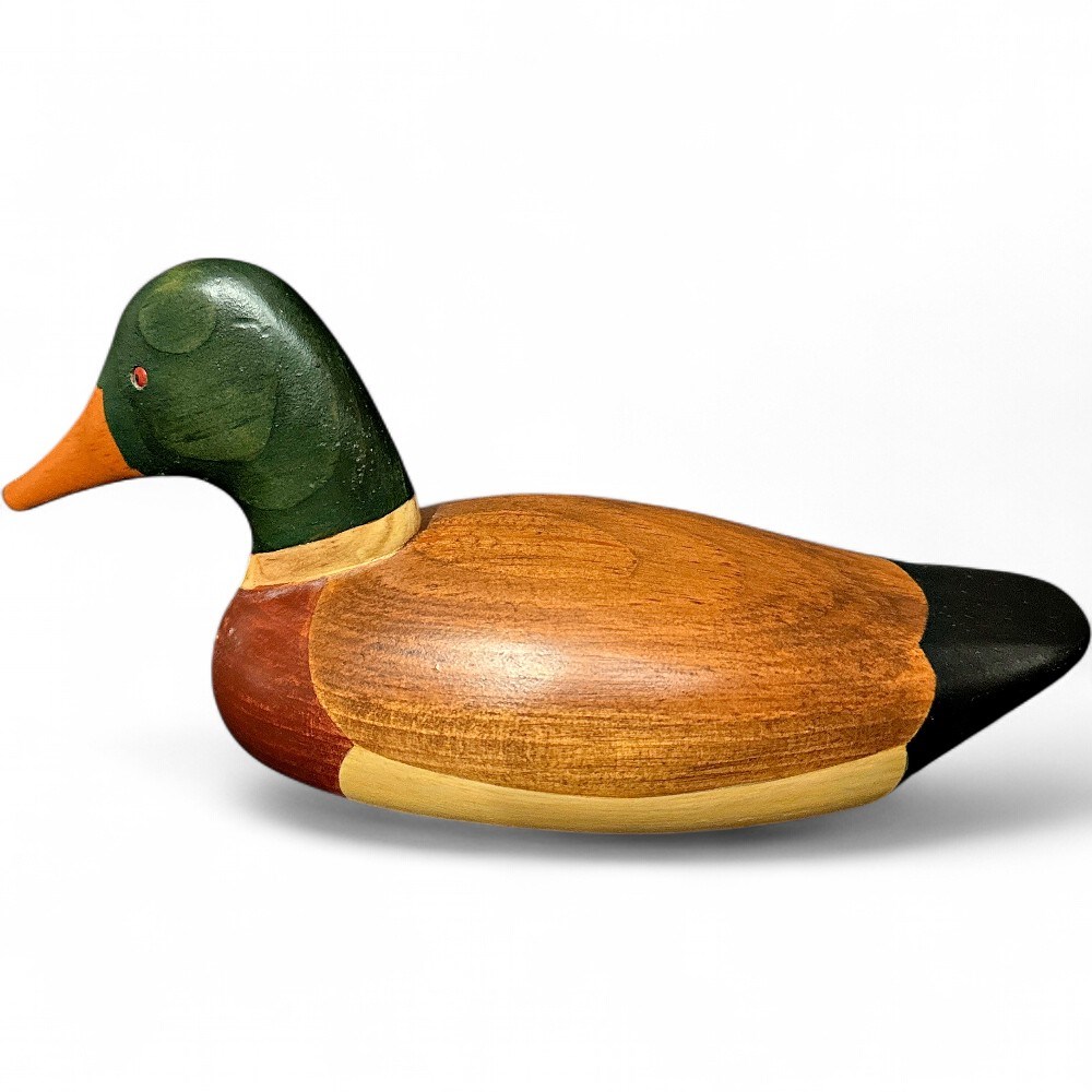 A hand-carved mallard duck decoy created by the Canadian artist Jim Harkness of Stayner, Ontario. The decoy is carved from solid wood and hand-painted. Harkness is a well-known artist in the field of wood carving, and his works are considered collectible items. It depicts a male mallard (drake) with typical coloration: a glossy green head, a yellow/orange bill, a brown breast, and a mostly natural wood-toned body with painted feather details. The piece is signed and dated 1985 by the artist at underside. 8" L Good condition.