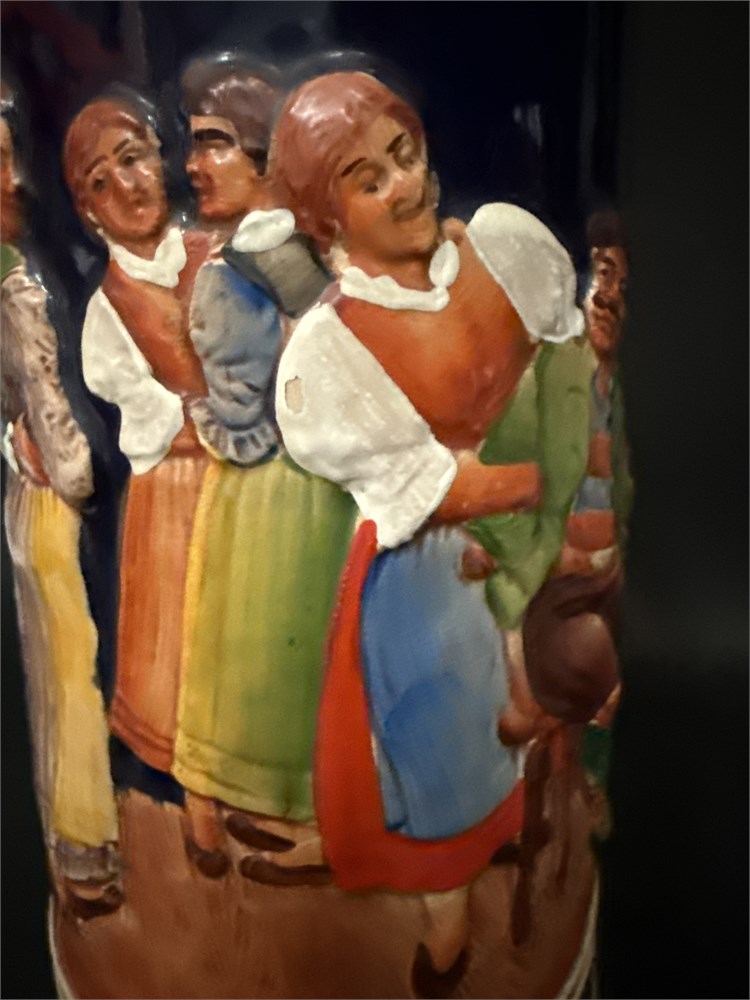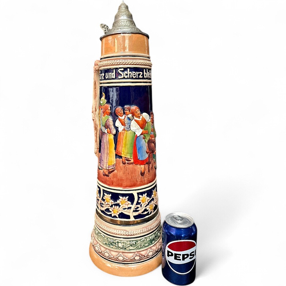 A large, vintage German Gerz ceramic beer stein featuring a tavern scene and a pewter lid. It is approximately 4 liters in capacity. The handle is crafted to resemble a twisted branch. The text around the top band translates to "The heart stays happy when dancing and joking". The stein is considered a collectible item, often sought after by enthusiasts. 21” height. Base is 7” across Good condition.